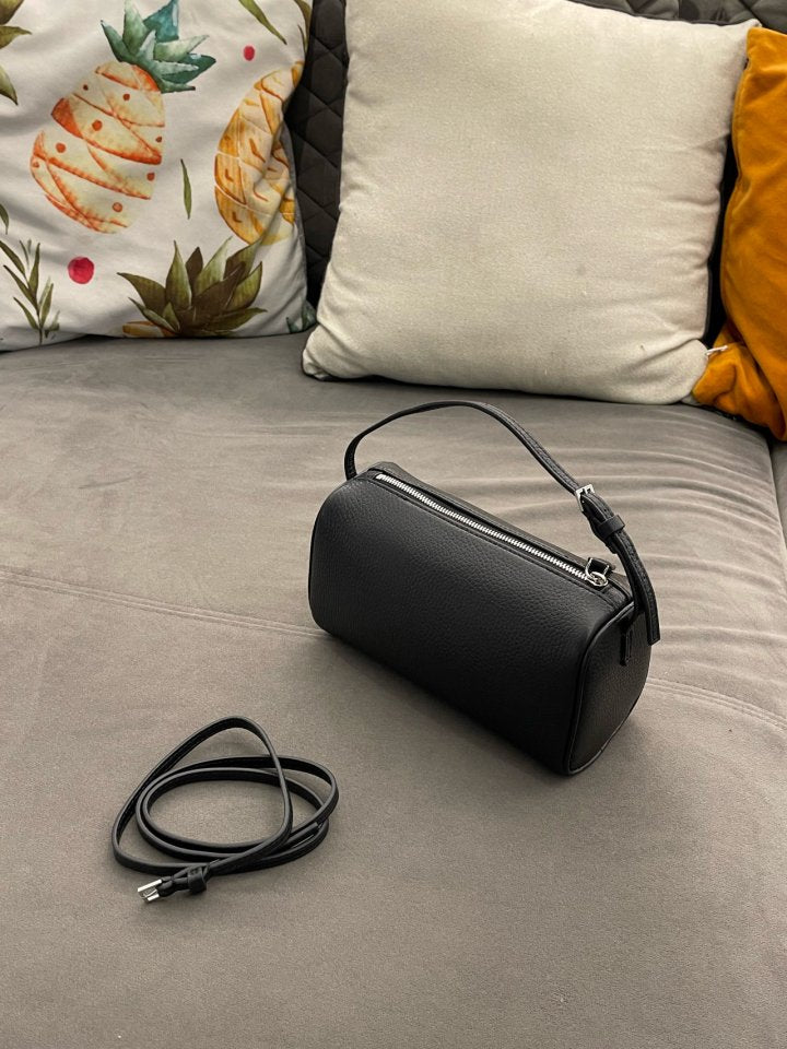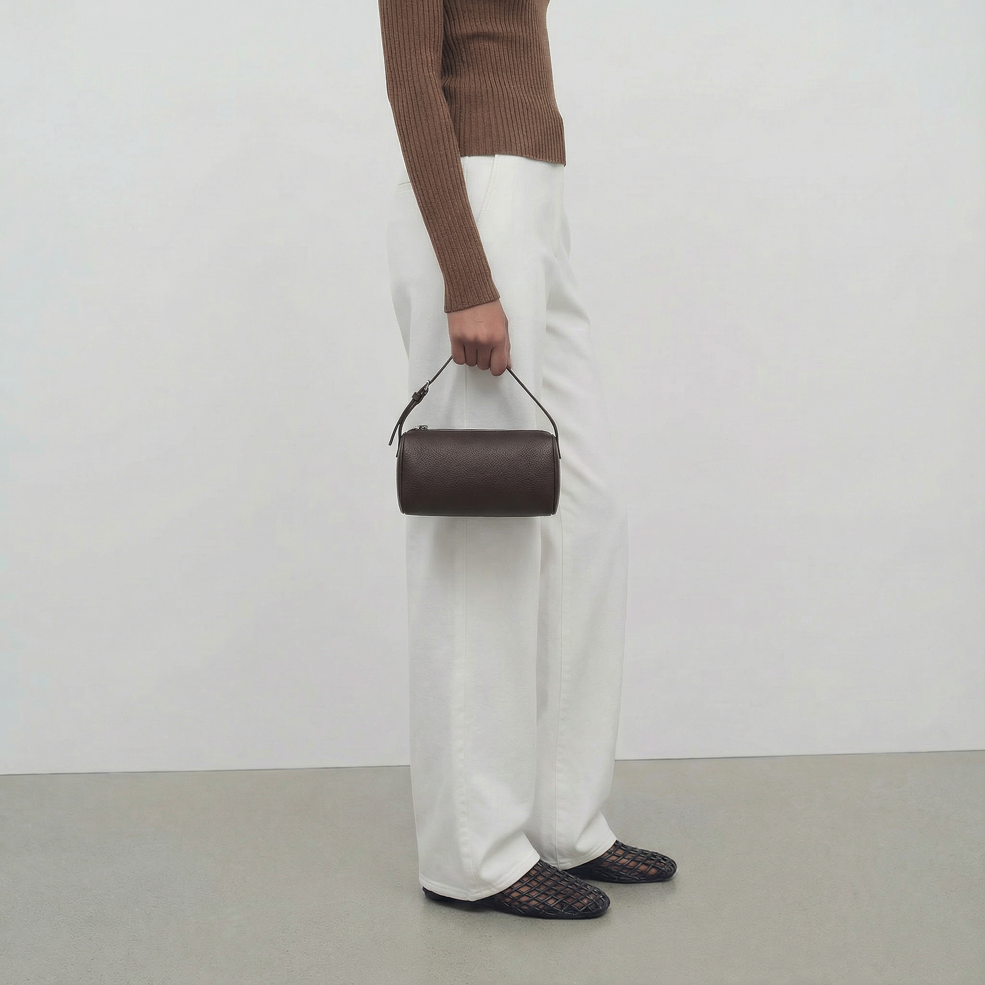 A high-end barrel silhouette crafted in premium cowhide leather with a soft lambskin interior, featuring a structured yet refined shape, an adjustable strap, smooth zip-top closure, and elevated minimal detailing — a luxurious compact tote designed for effortless everyday elegance.