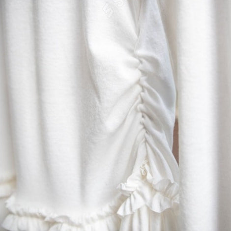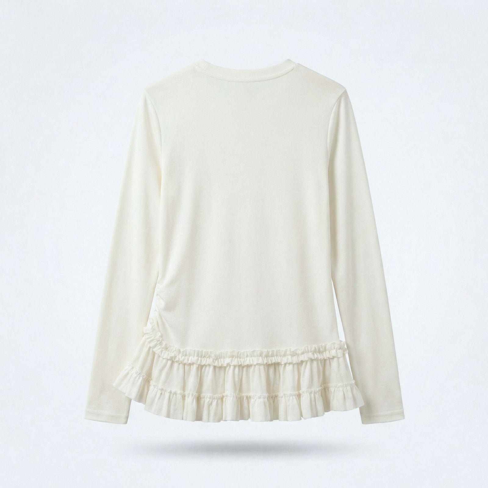 A refined long sleeve top designed with delicate gathered frill detailing along the hem. The layered ruffle finish adds subtle movement and dimension, while the side shirring gently enhances the silhouette for a balanced, flattering shape.