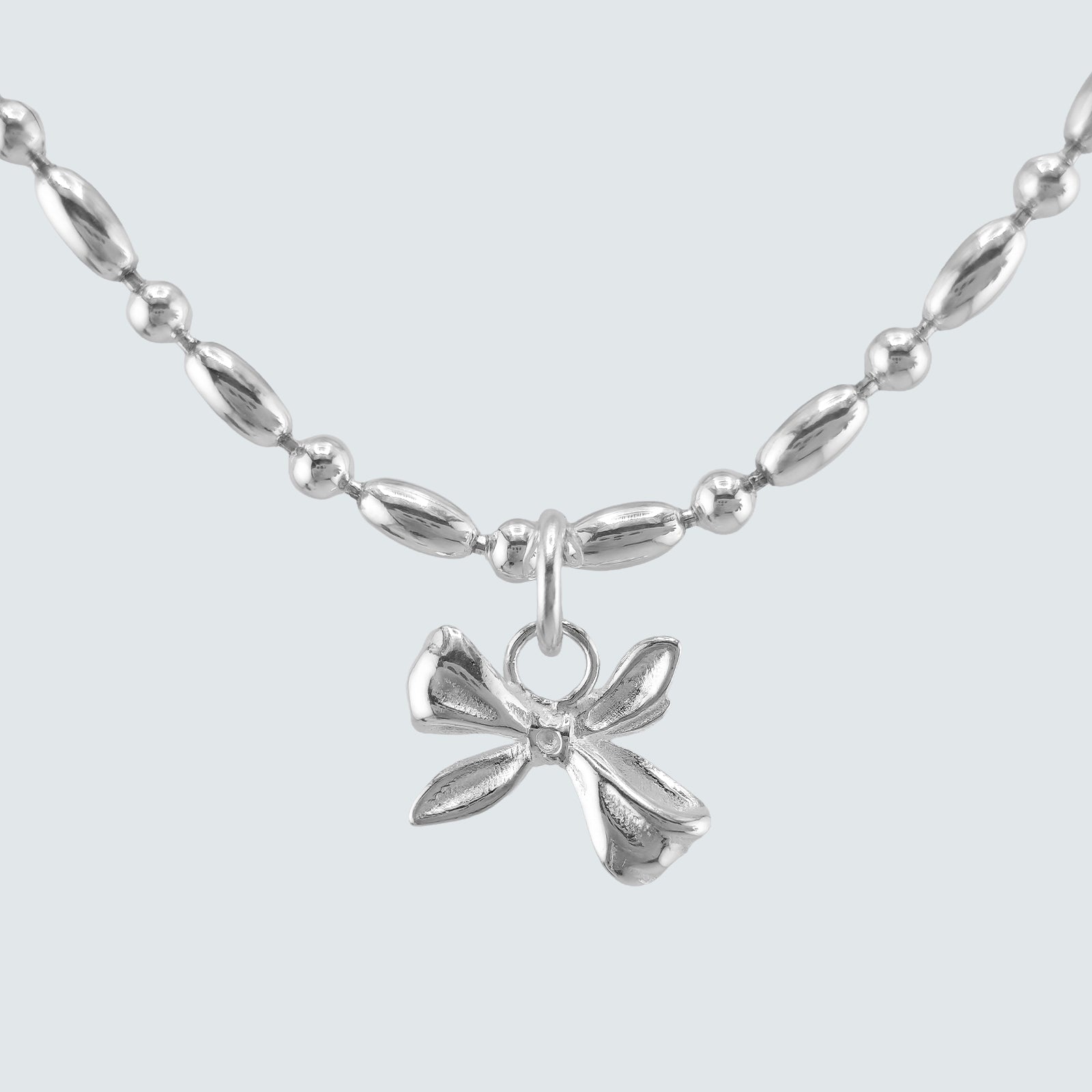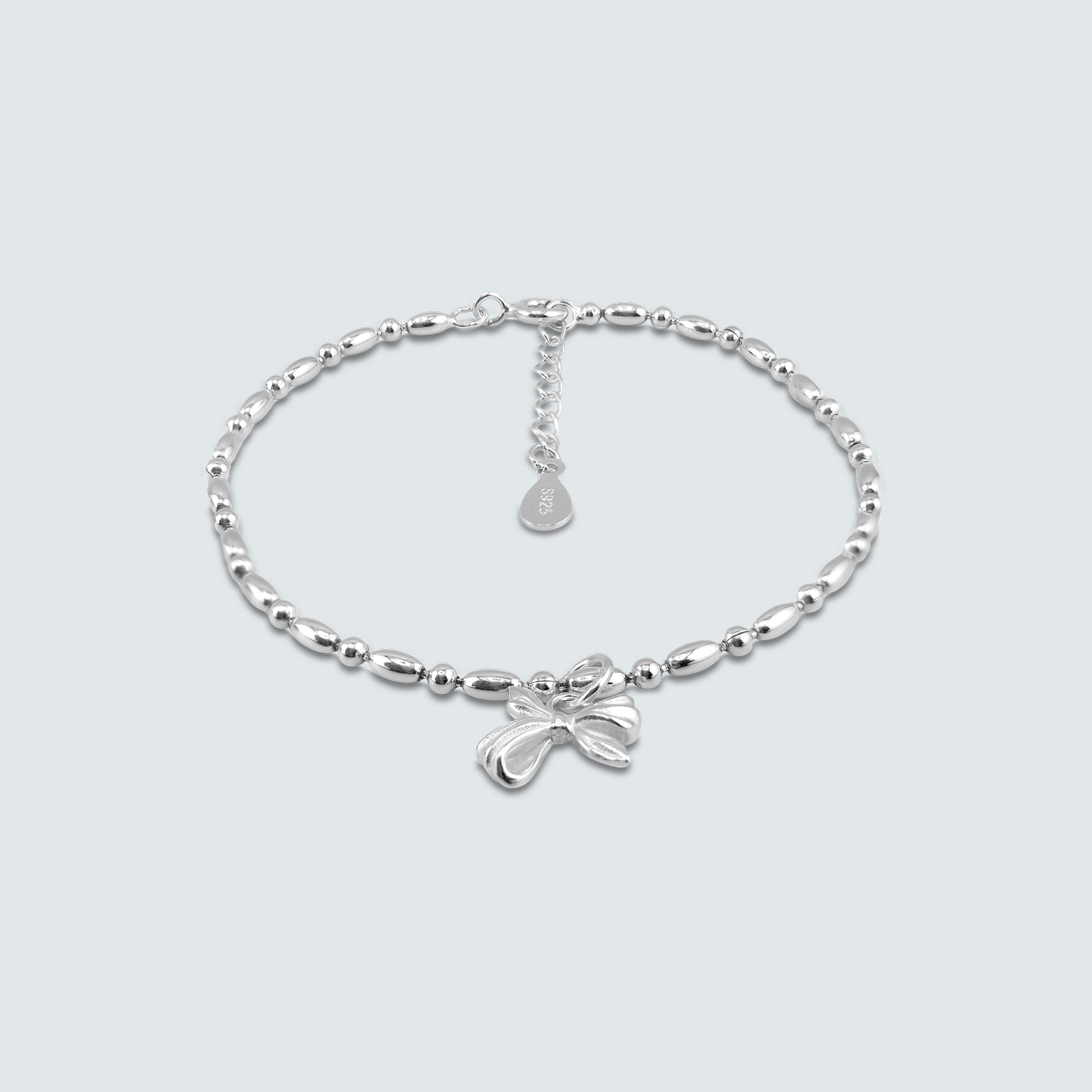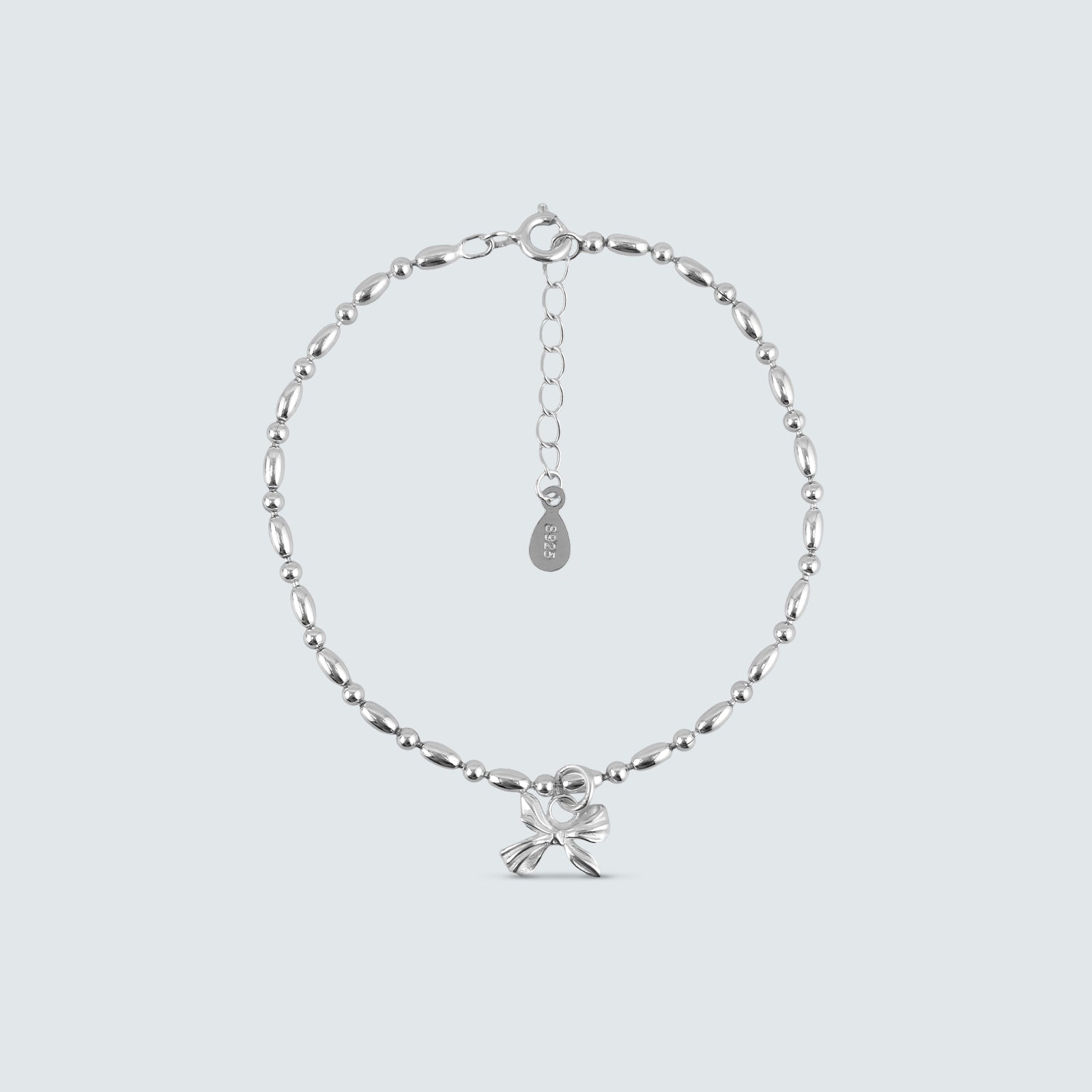 A delicate sterling silver bracelet adorned with a dainty bow charm and fine beaded chain. Its playful yet elegant design adds a soft feminine touch — perfect for layering or gifting to someone special. Handcrafted for everyday wear with timeless charm.