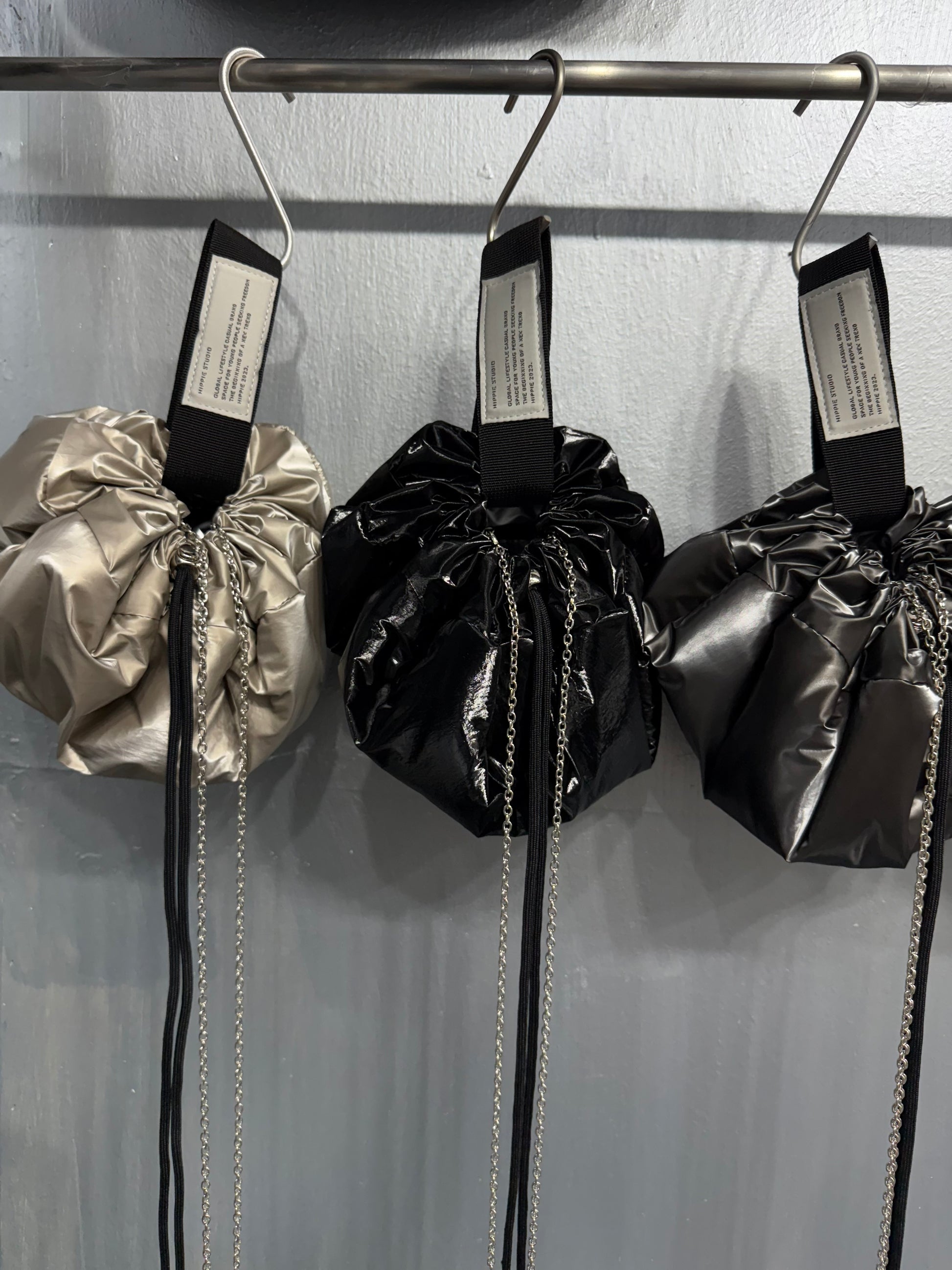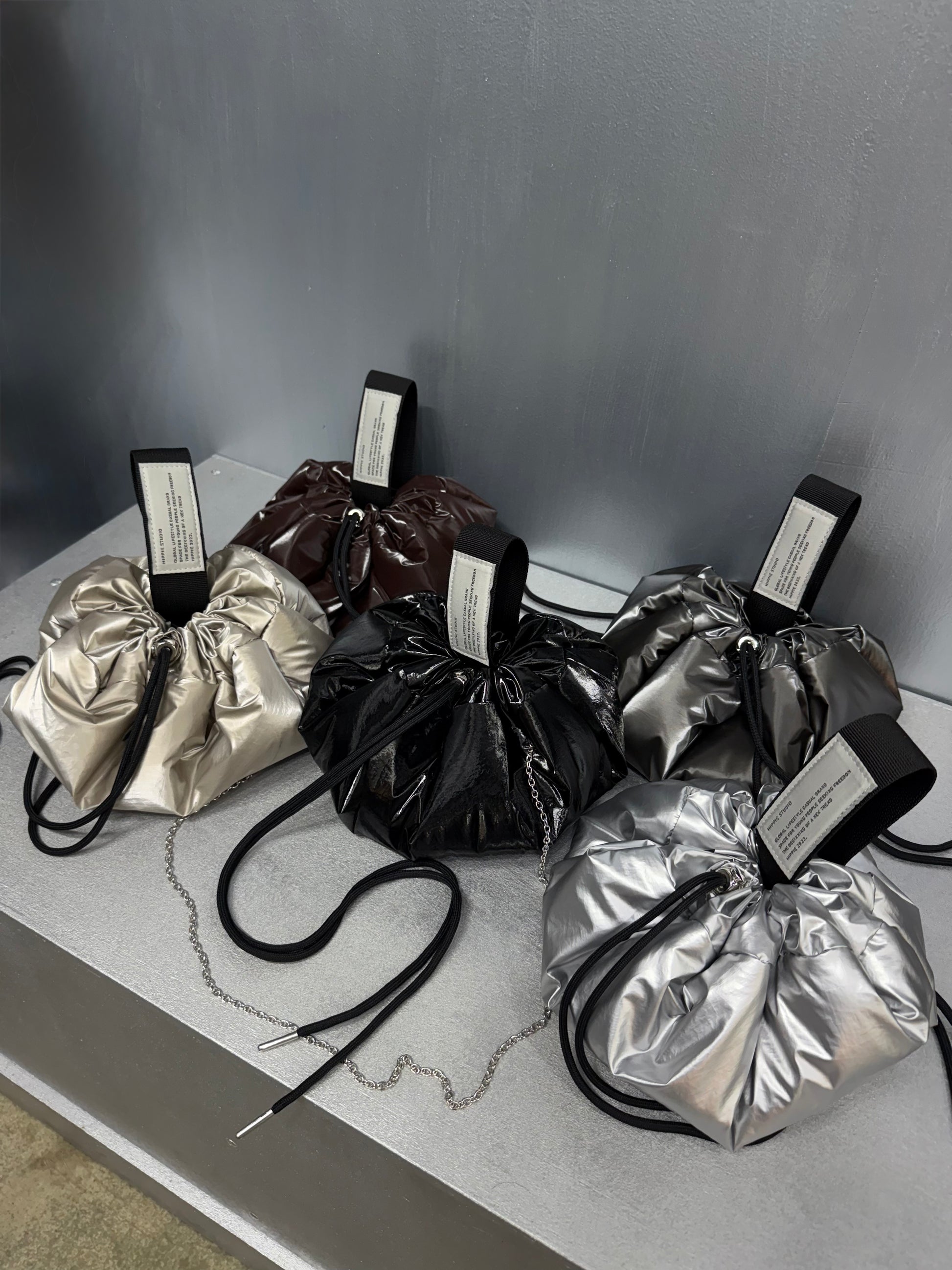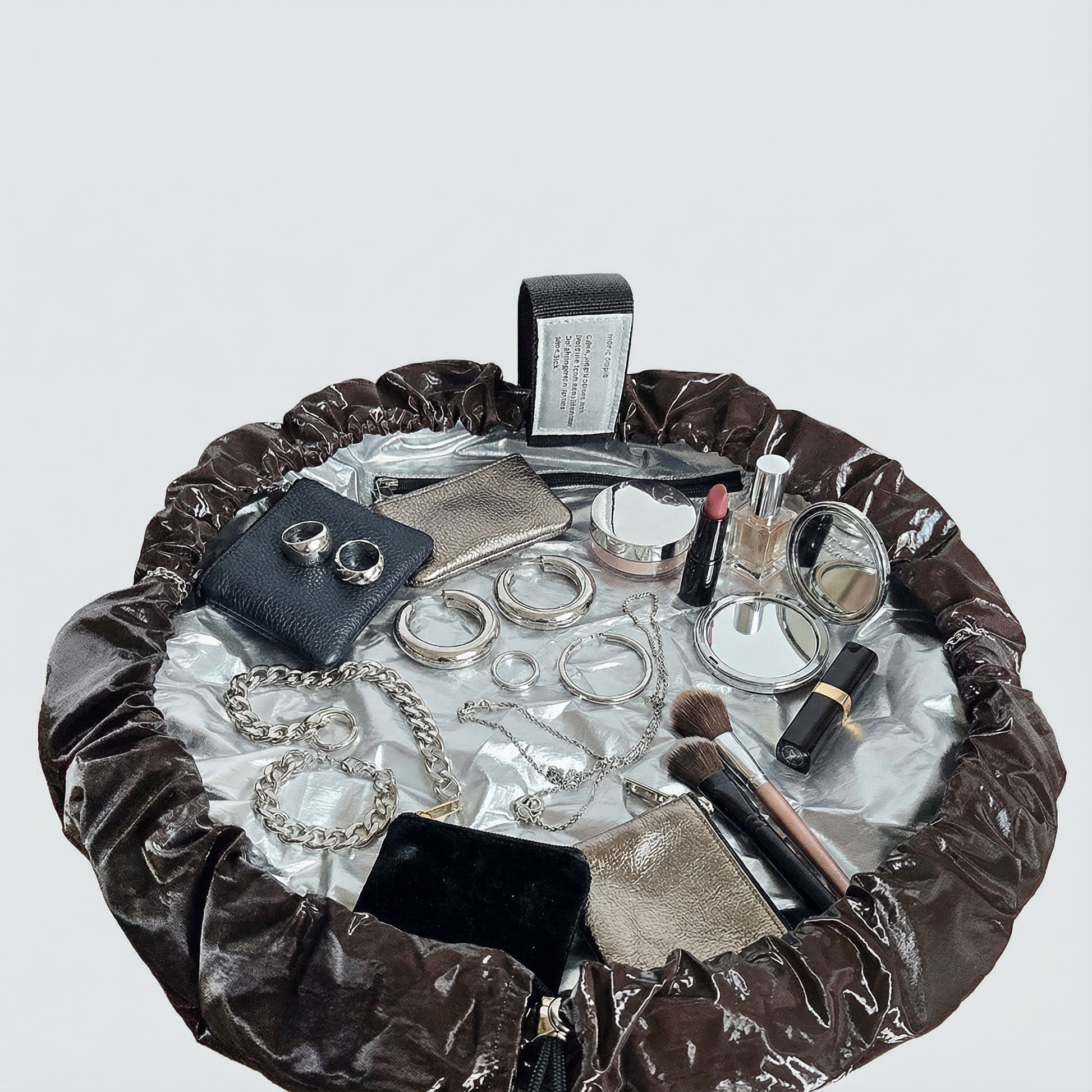 A soft, cloud-like padded tote designed with a rounded silhouette and lightweight shine. This unique 2-way design opens wide for effortless organization of beauty items, accessories, or travel essentials, then cinches into a voluminous padded pouch. Comfortable to carry and modern in shape, it blends daily practicality with a refined, sculptural aesthetic — a signature Jade & Clay piece.
