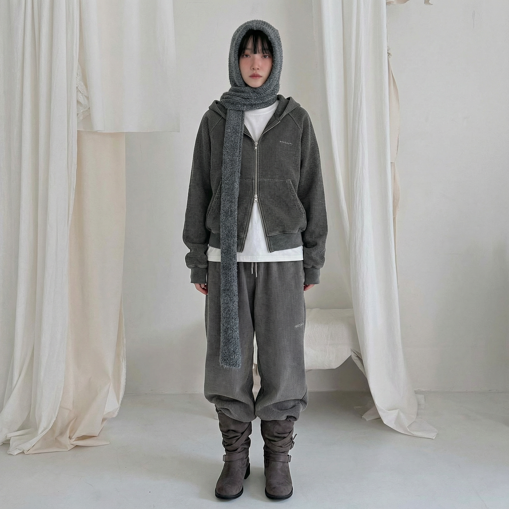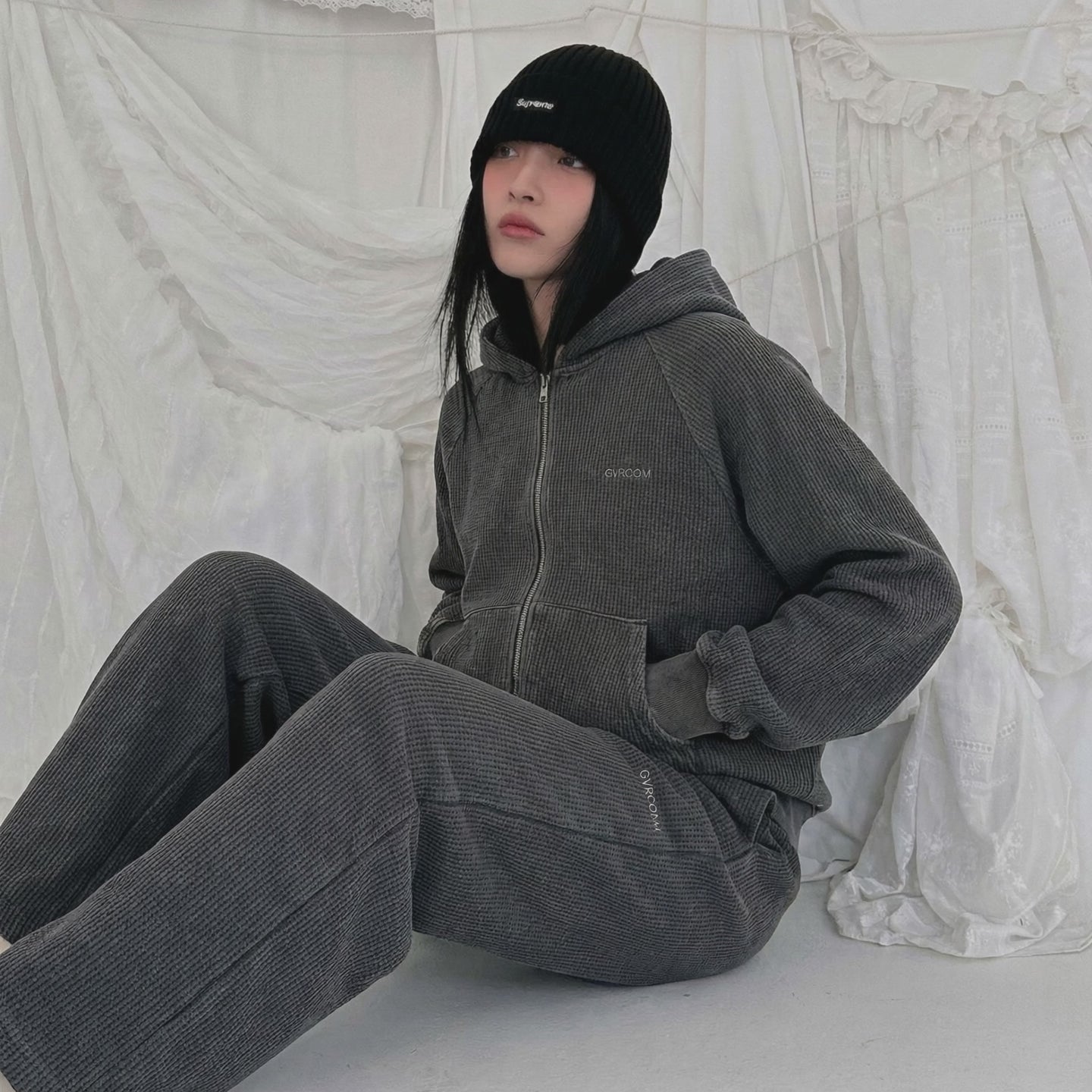 The pants feature a relaxed, loose fit that drapes beautifully, creating an effortless silhouette with natural movement. In contrast, the top is intentionally balanced—not overly loose or long—offering a clean, refined fit that feels just right.