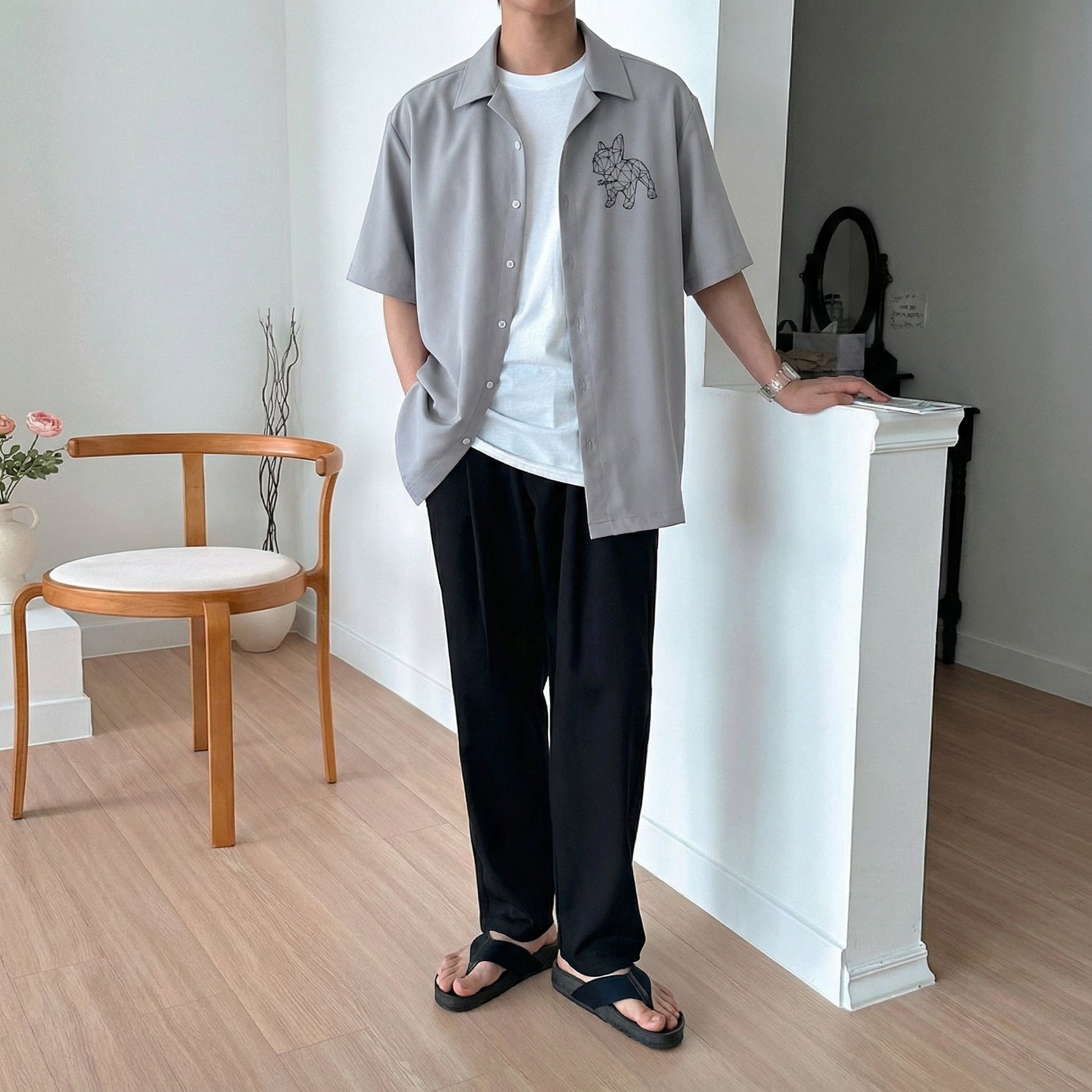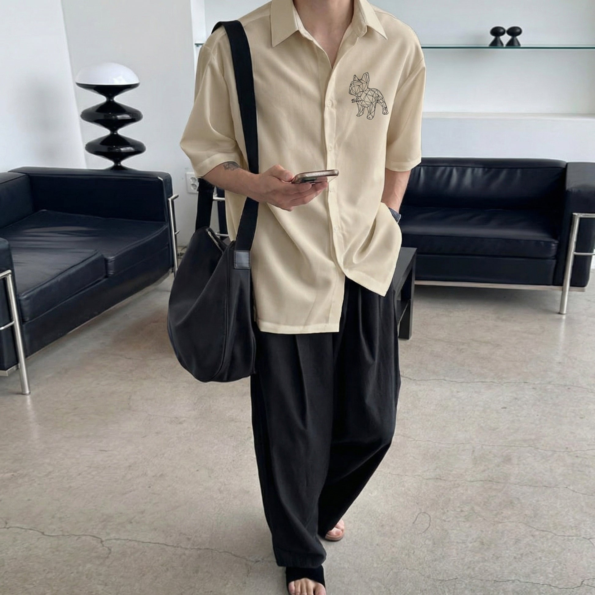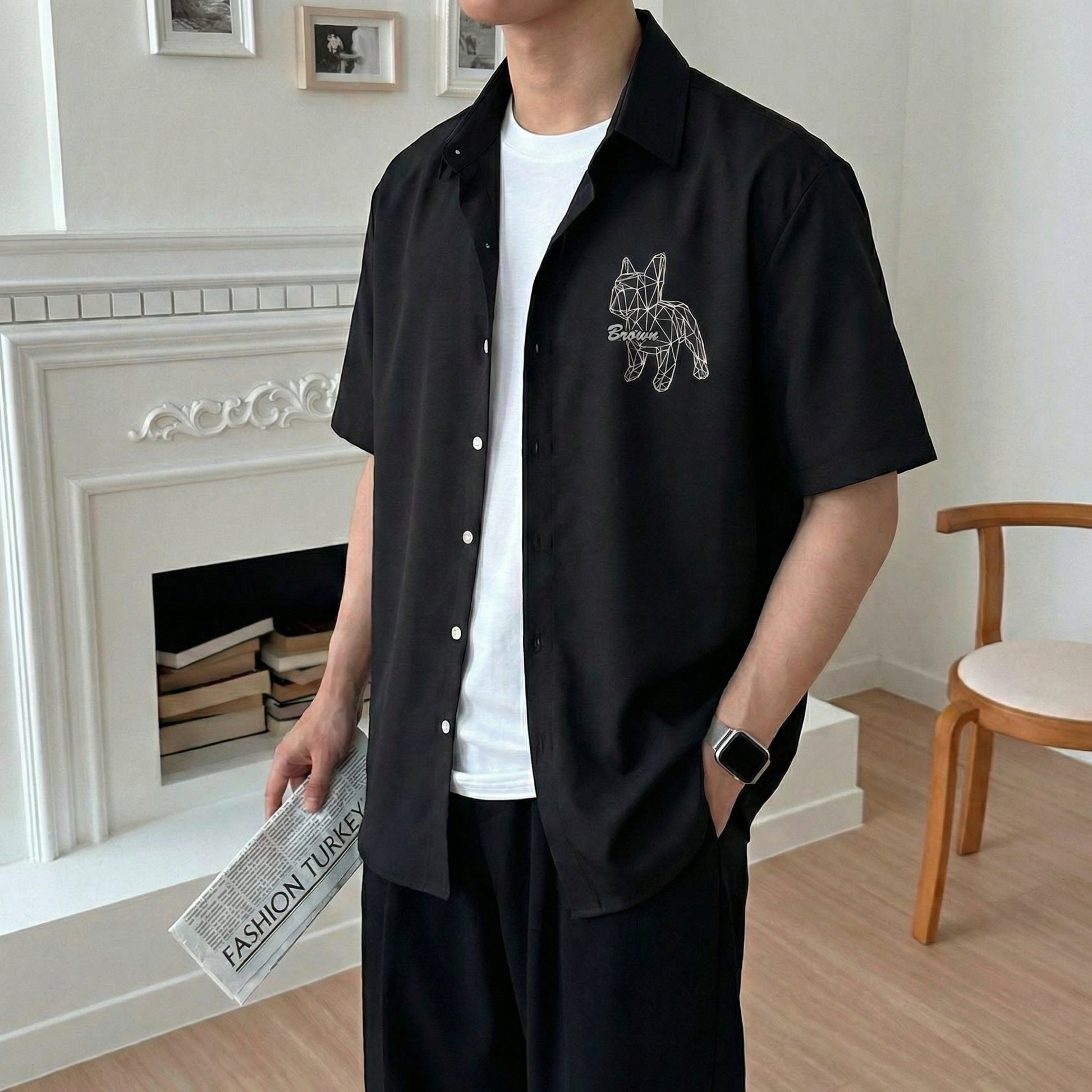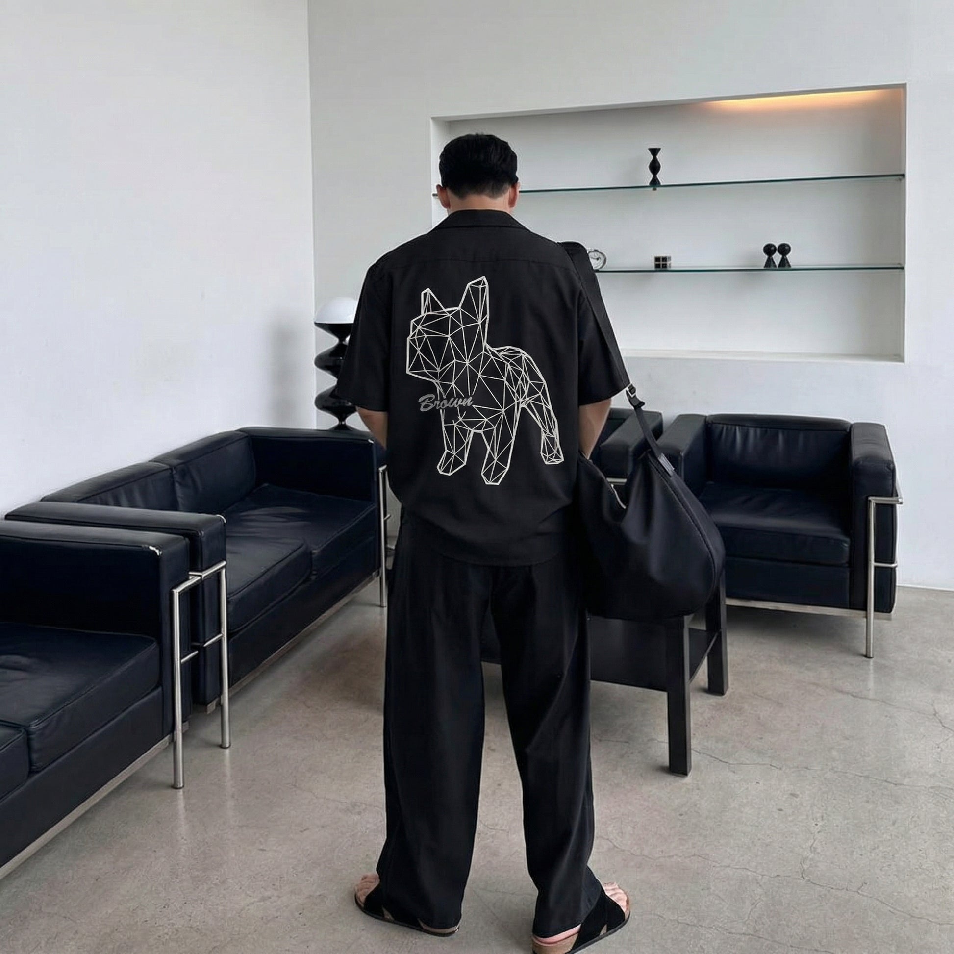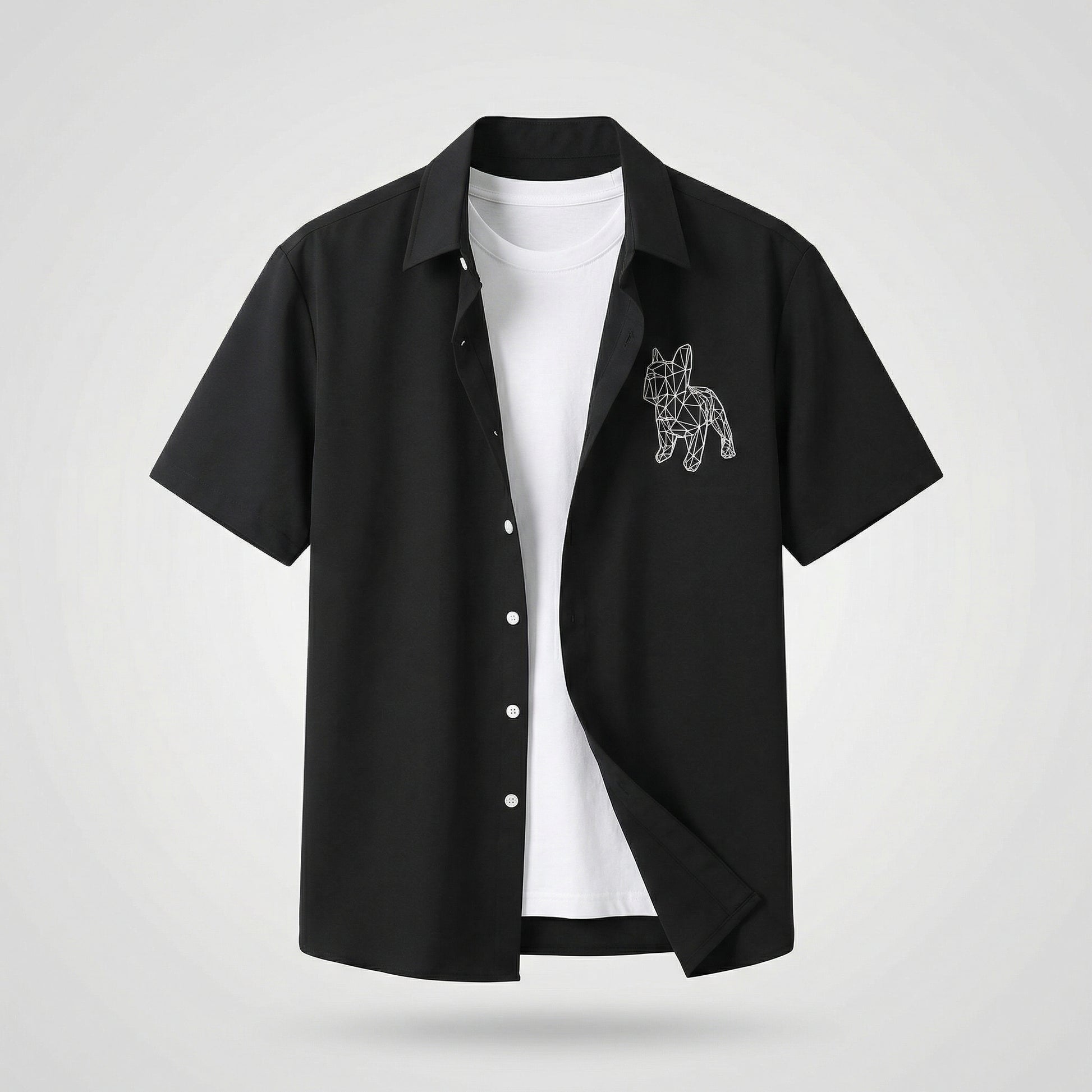 This short-sleeve shirt features a signature geometric Bulldog print that defines the entire piece. The low-poly line-art design gives the classic bulldog silhouette a modern, architectural edge — minimal yet striking.