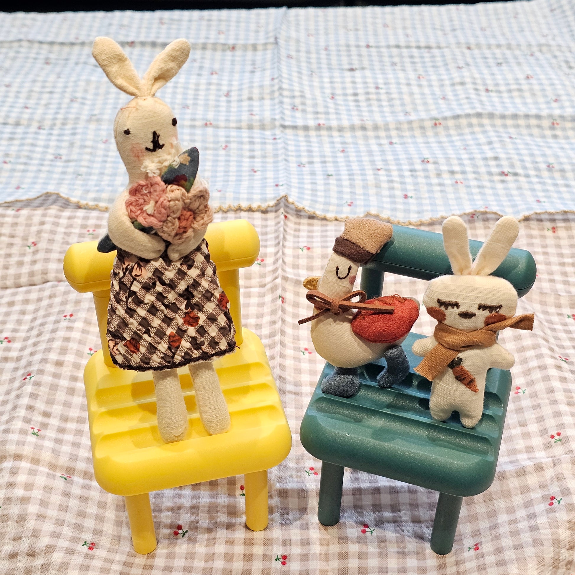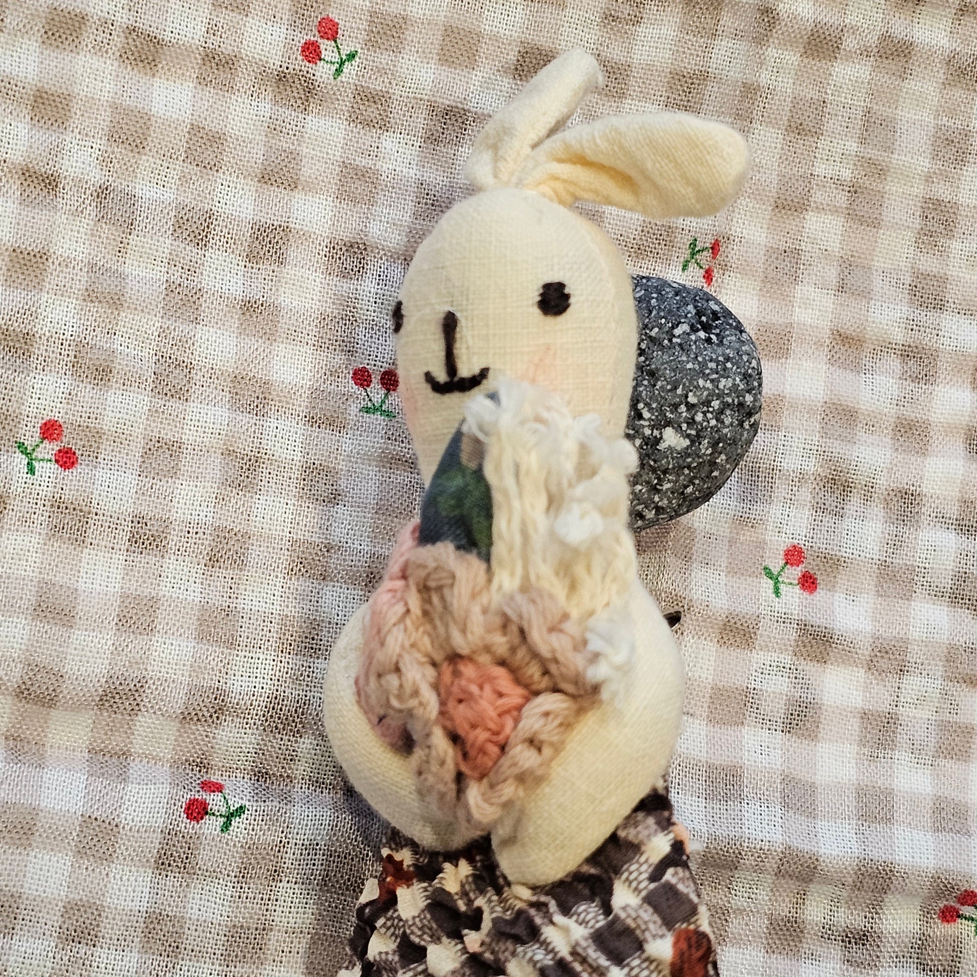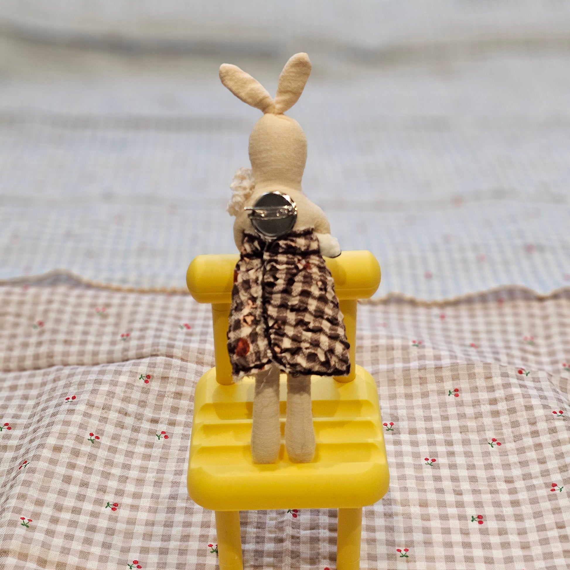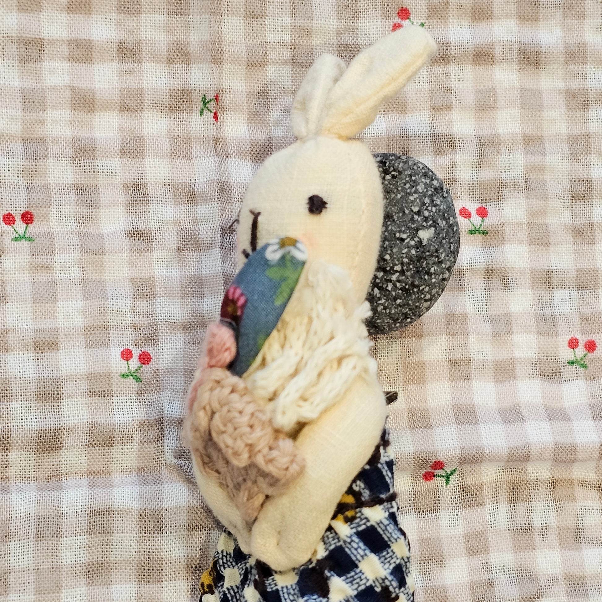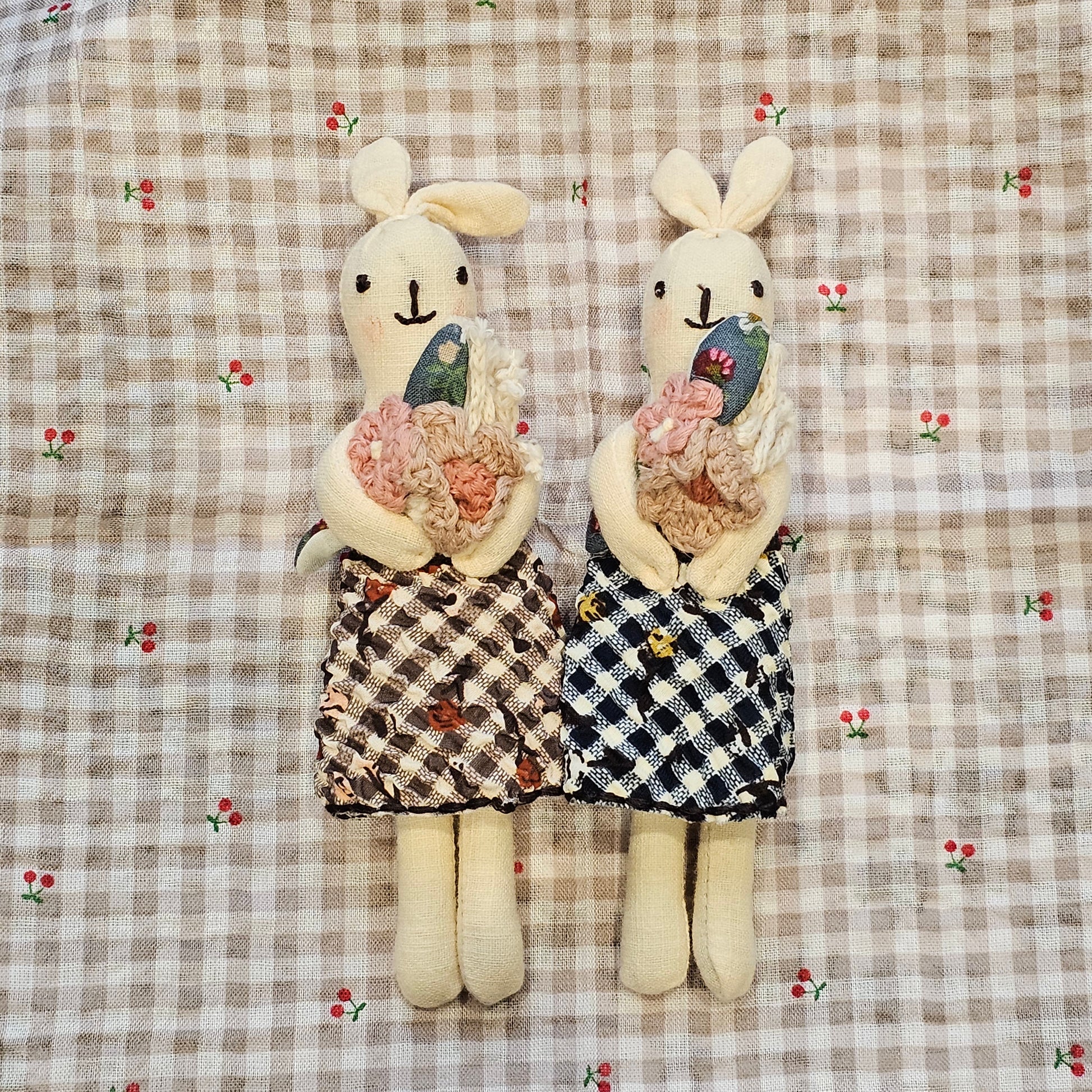 This adorable rabbit brooch is carefully handcrafted using fabric, embroidery, and crochet details. Dressed in a gingham dress and holding a delicate floral bouquet, each piece carries a warm, nostalgic feel that makes your bag, jacket, or pouch truly special.