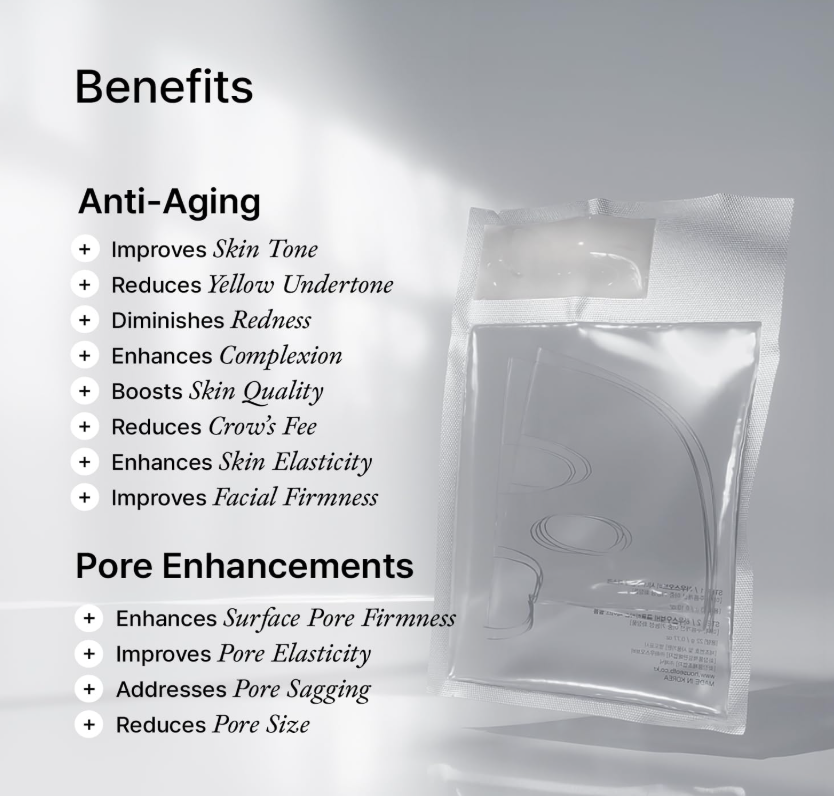 The ultra-thin film mask adheres closely to the skin, supporting improved elasticity, refined texture, and a brighter, more youthful-looking complexion.