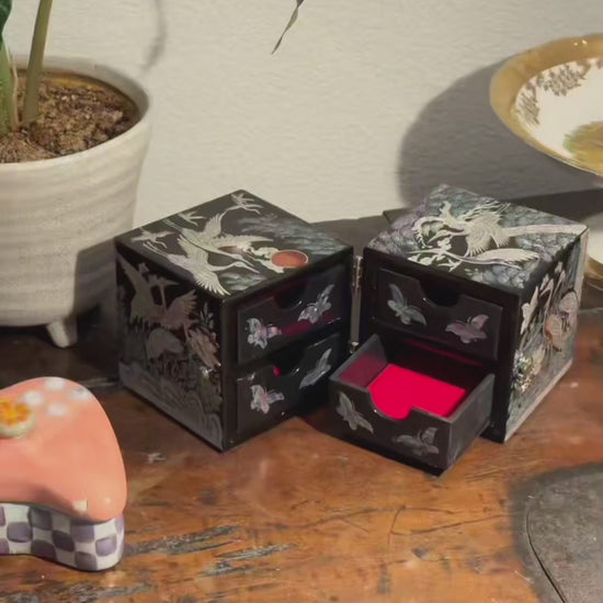 A refined JAGAE (Korean Mother of Pearl) jewelry box crafted with a classic black lacquer finish, detailed crane and butterfly artwork, smooth-opening drawers, and a decorative front clasp—an elegant cultural keepsake and a luxurious gift to cherish for a lifetime.