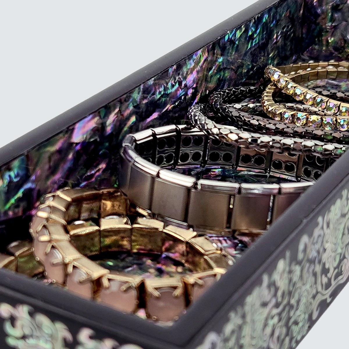 A luxurious long box crafted with traditional Korean Jagae mother-of-pearl, perfect for pens, watches, and jewelry, featuring a premium lacquer finish and a stunning abalone interior for elegant home or office display.