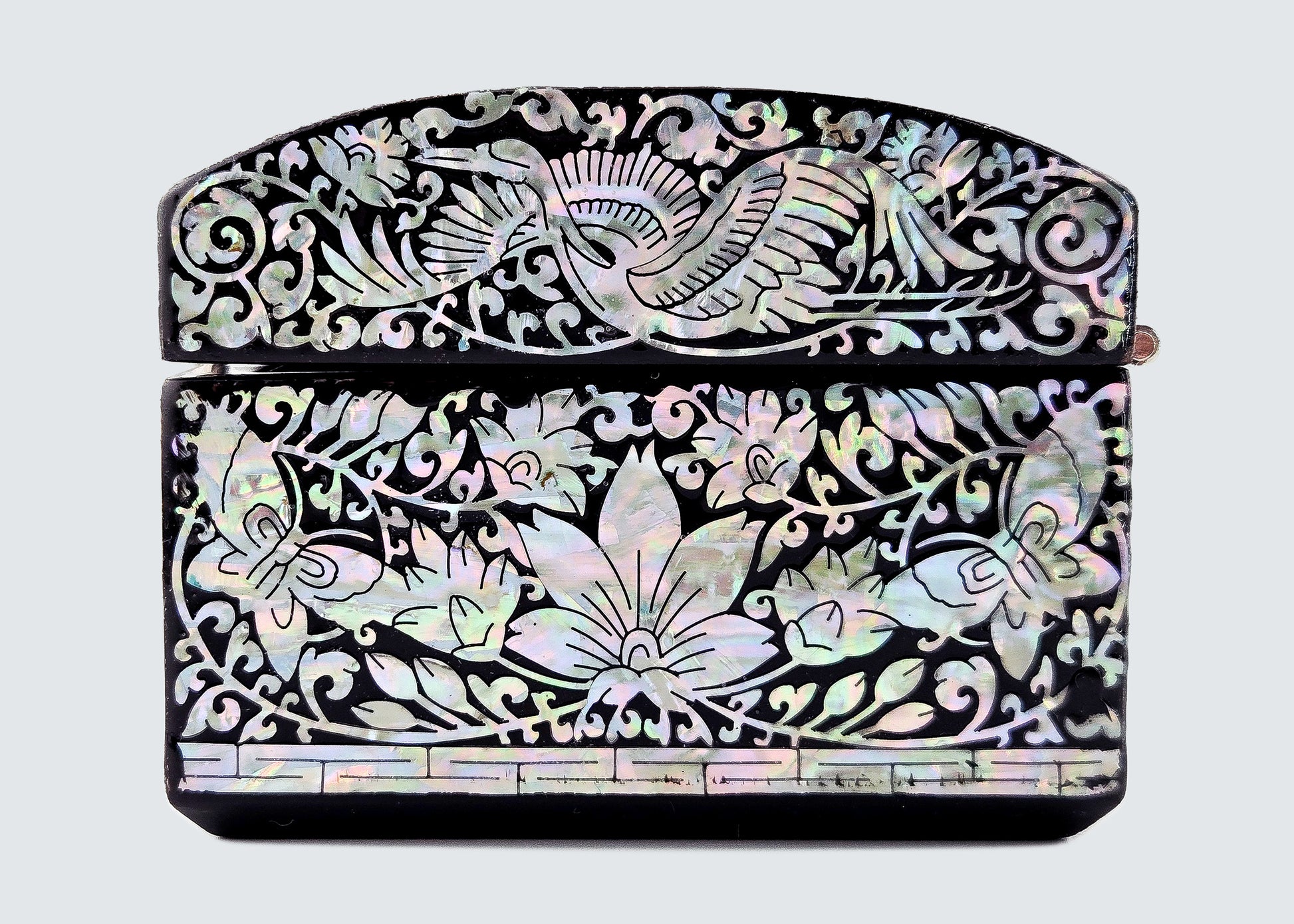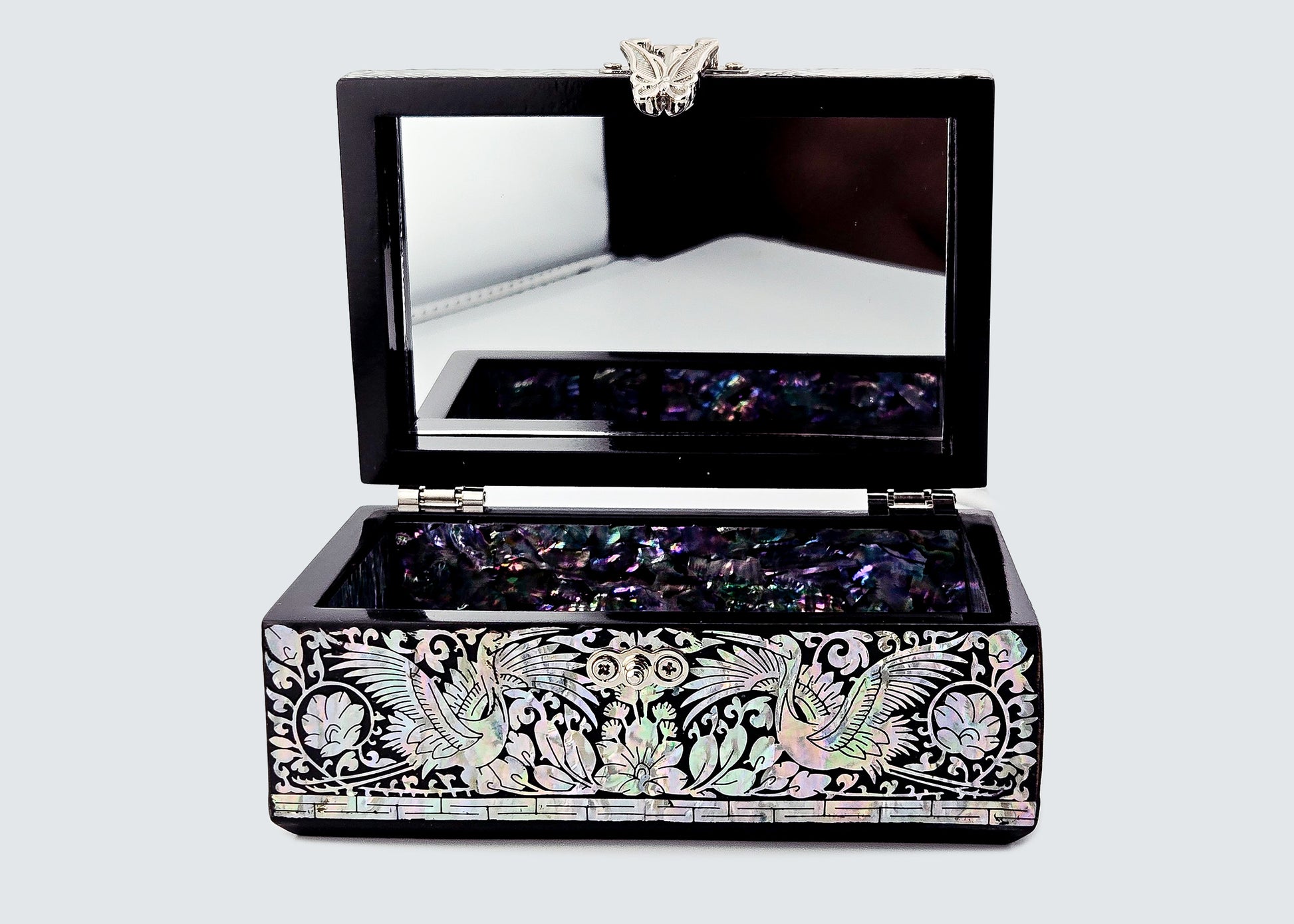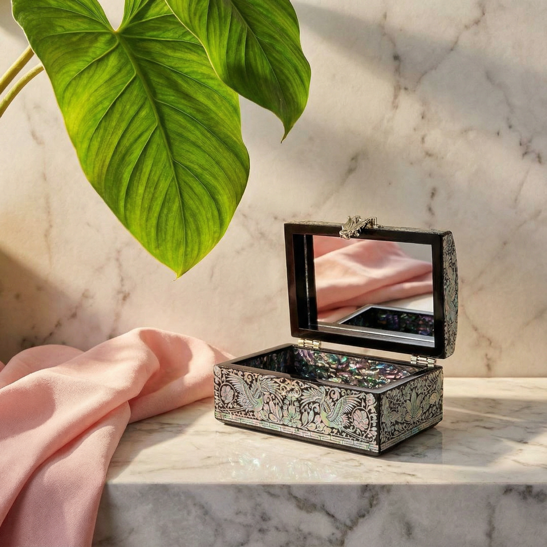A handcrafted Jagae (Korean Mother-of-Pearl) premium treasure box in elegant black, featuring intricate nacre inlay, a butterfly clasp, and a fully lined iridescent interior. This refined piece blends traditional Korean craftsmanship with modern luxury, making it a timeless keepsake and a truly meaningful gift for any special occasion.