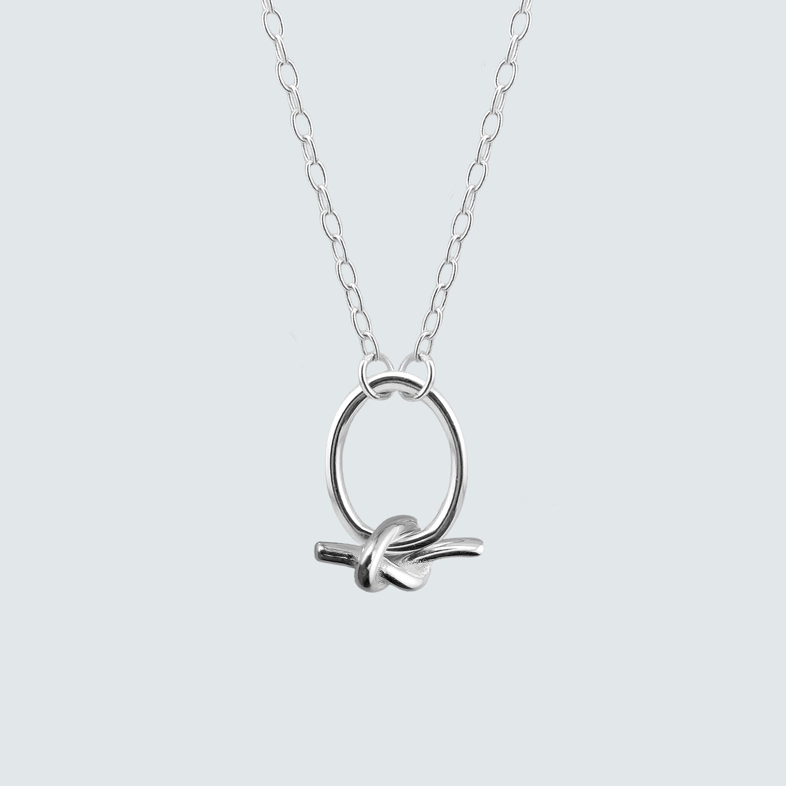 A minimal silver necklace featuring a delicate circular loop and a slender bar intertwined in balance — the subtle knot detail adds a sculptural, refined touch for an effortless modern look.