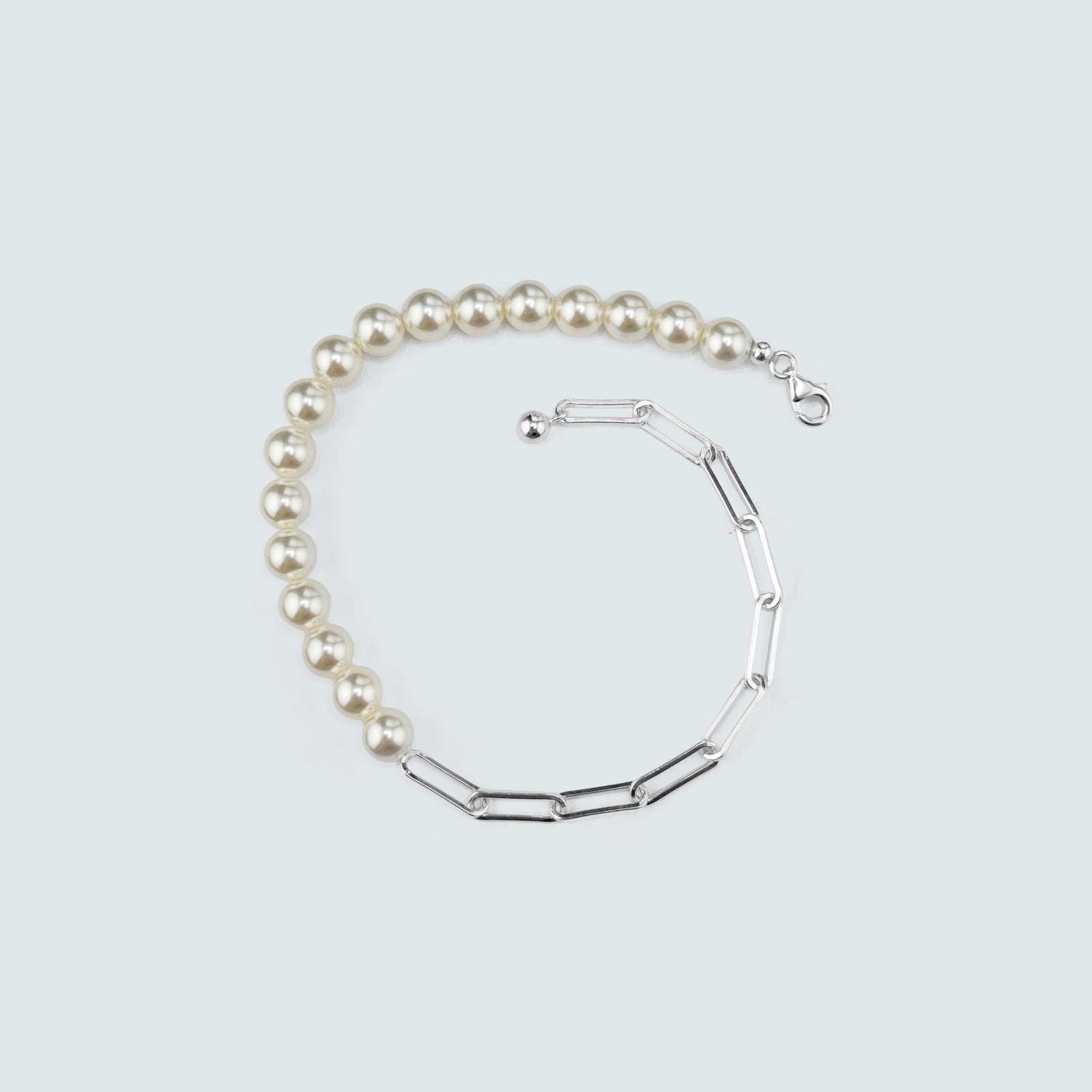 A modern take on classic pearls. Sleek rectangular silver links meet luminous Swarovski pearls, finished with a polished sphere for a refined, contemporary edge