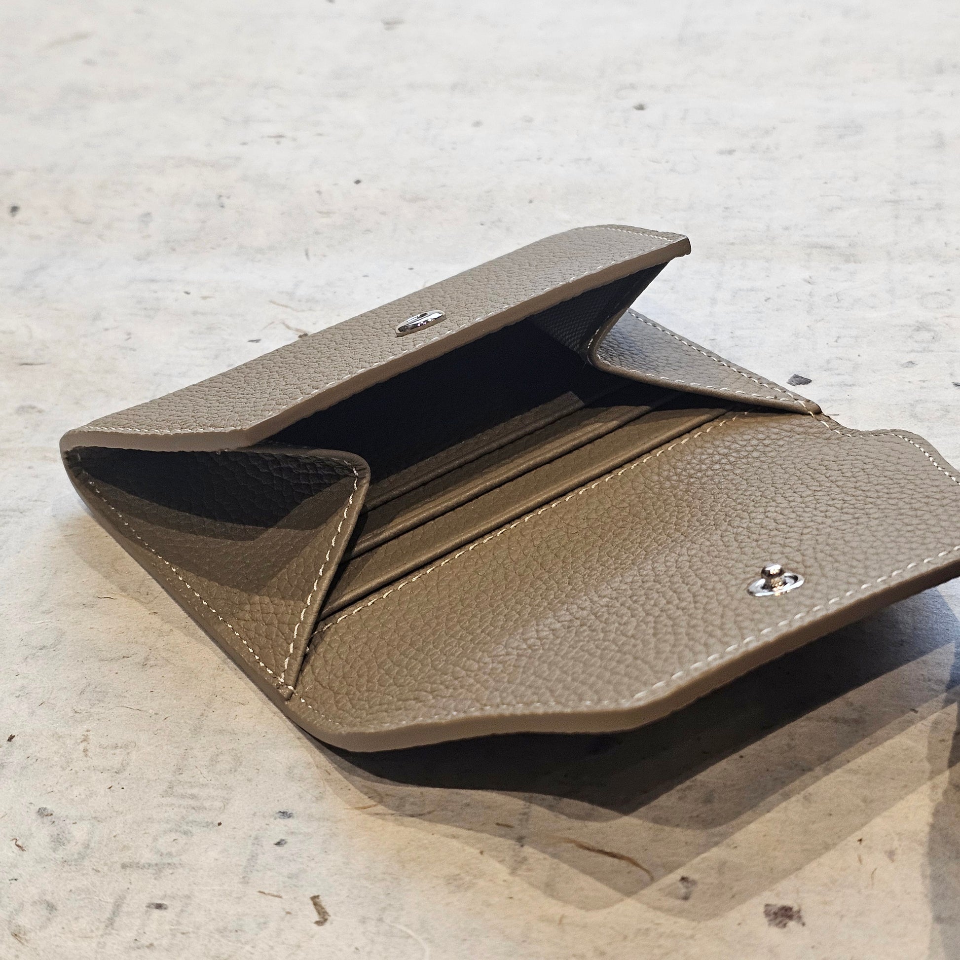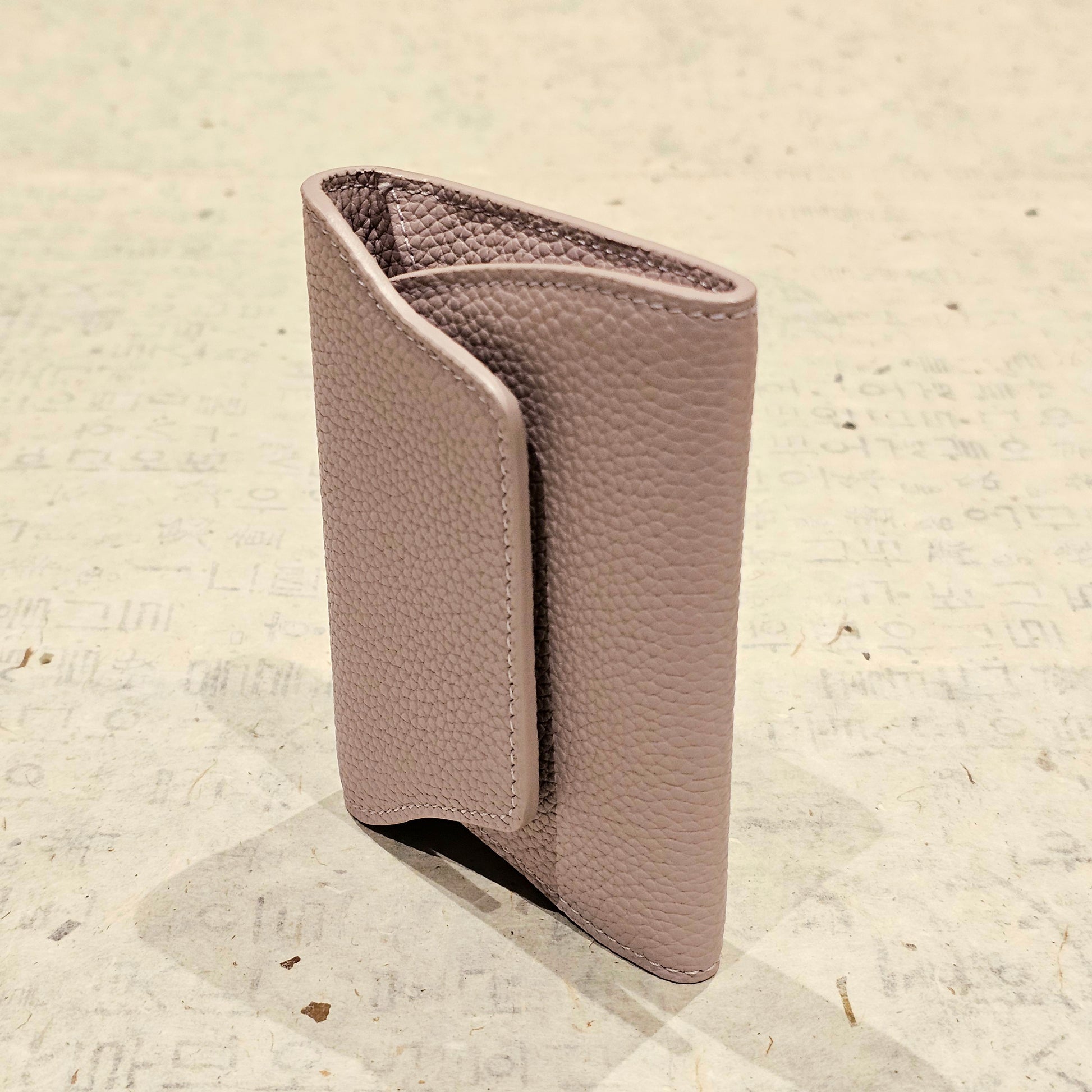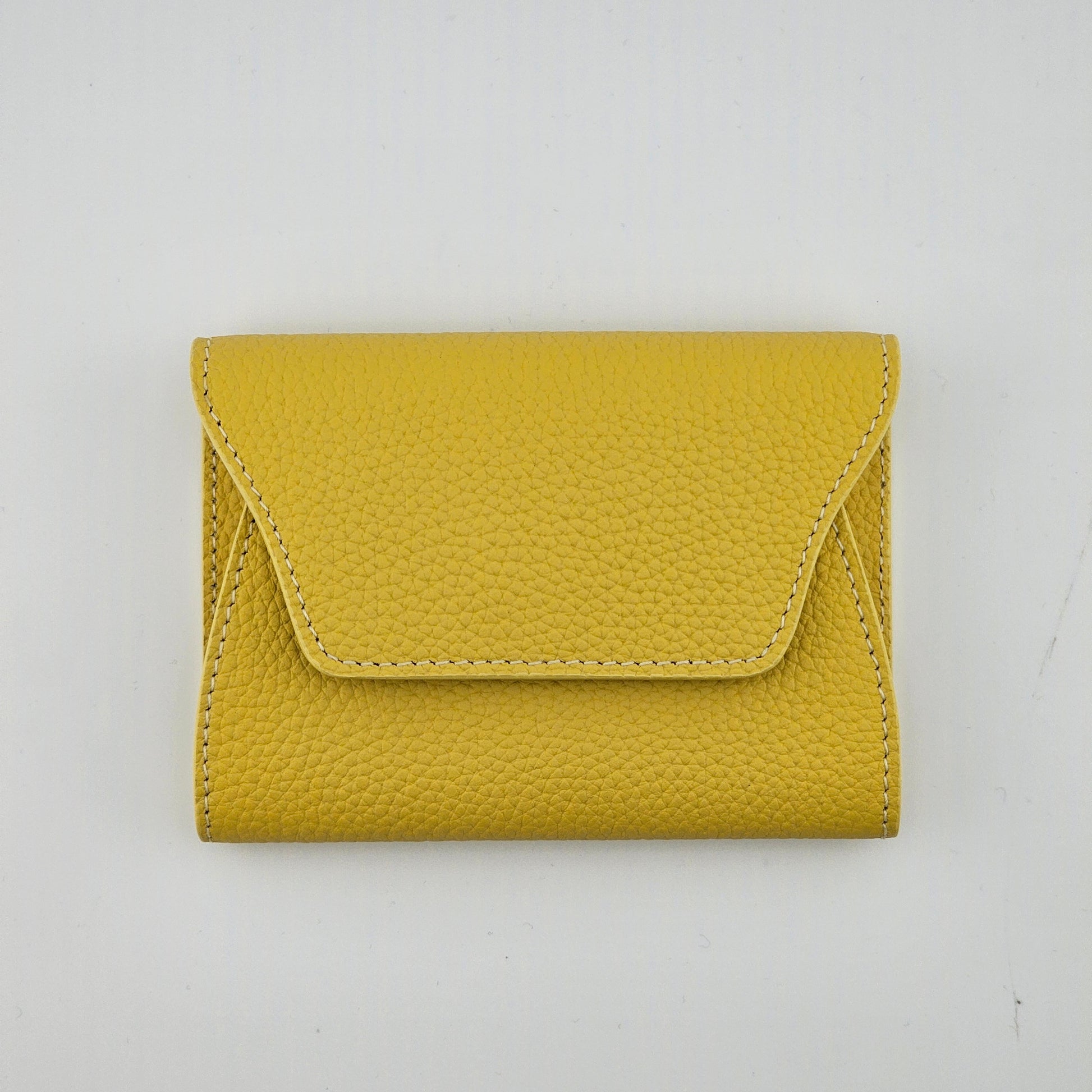 This mini leather card wallet is crafted from soft pebbled genuine leather, designed in a clean envelope silhouette with a secure snap closure. Compact yet surprisingly spacious, it comfortably holds folded bills and multiple cards without bulk.