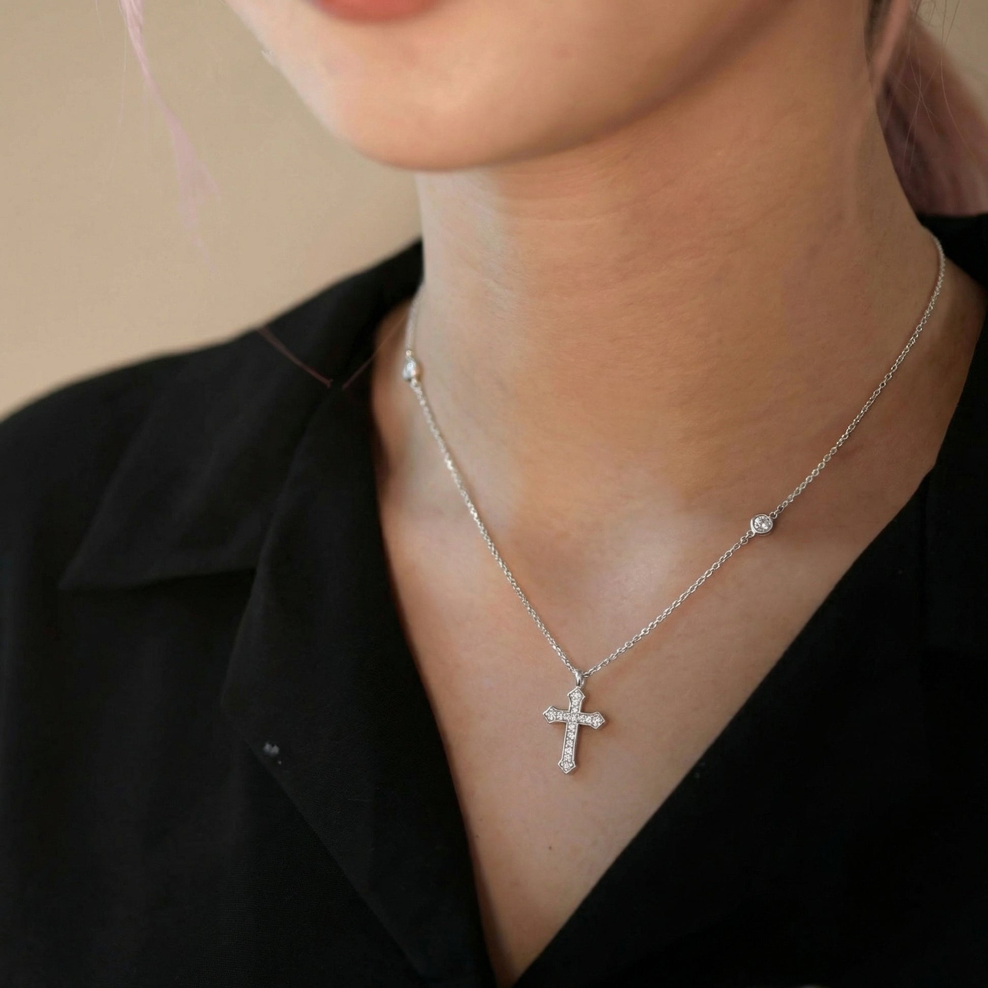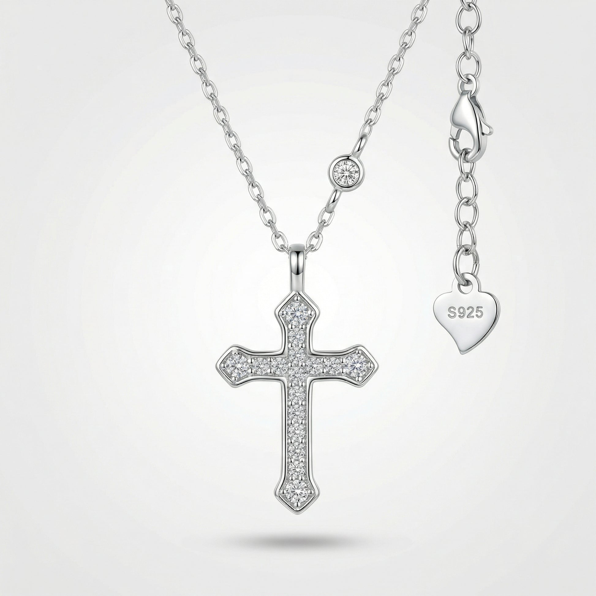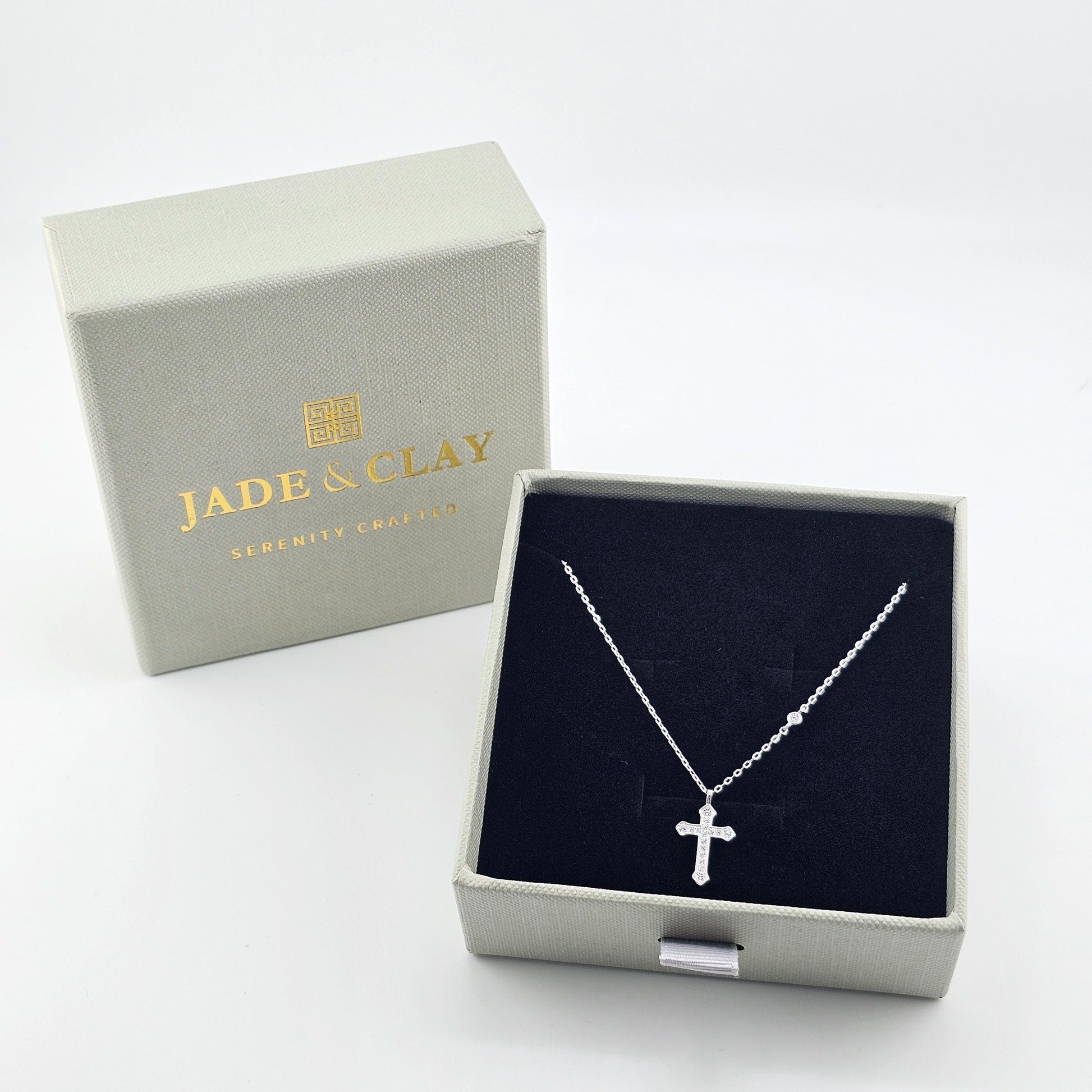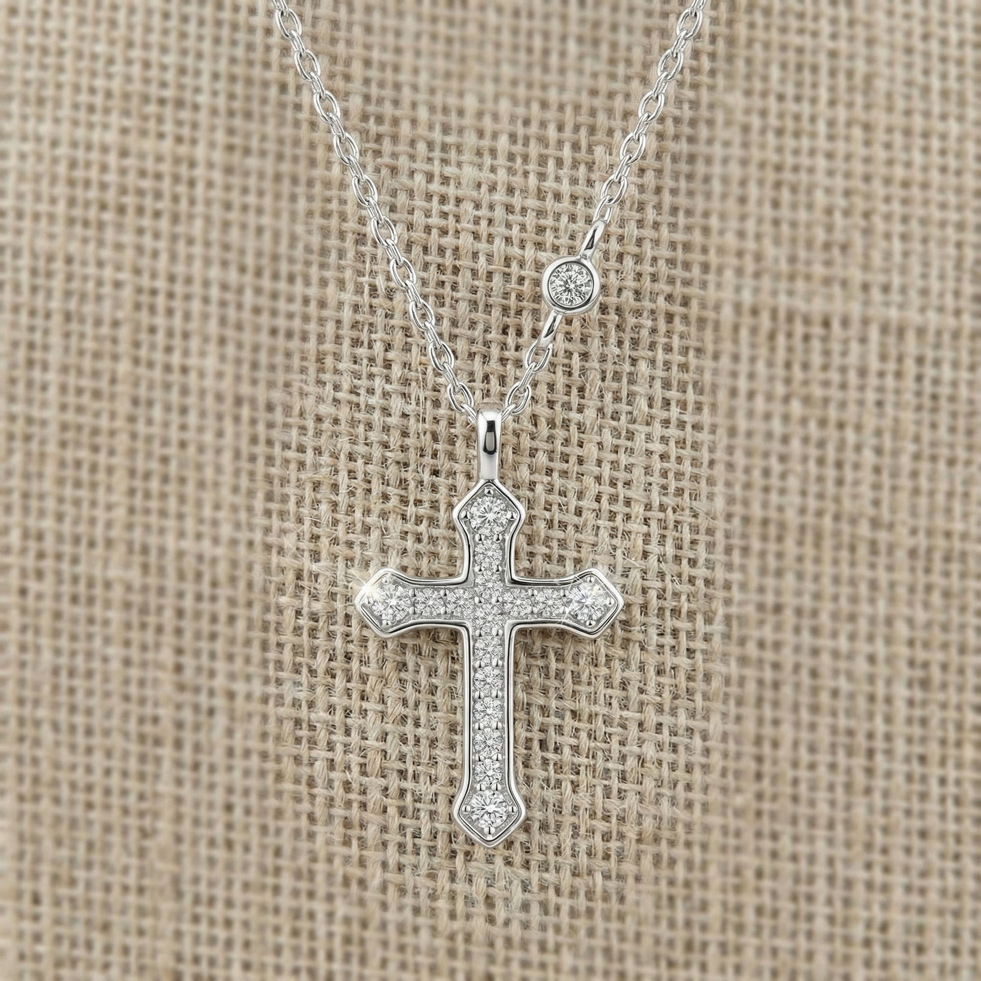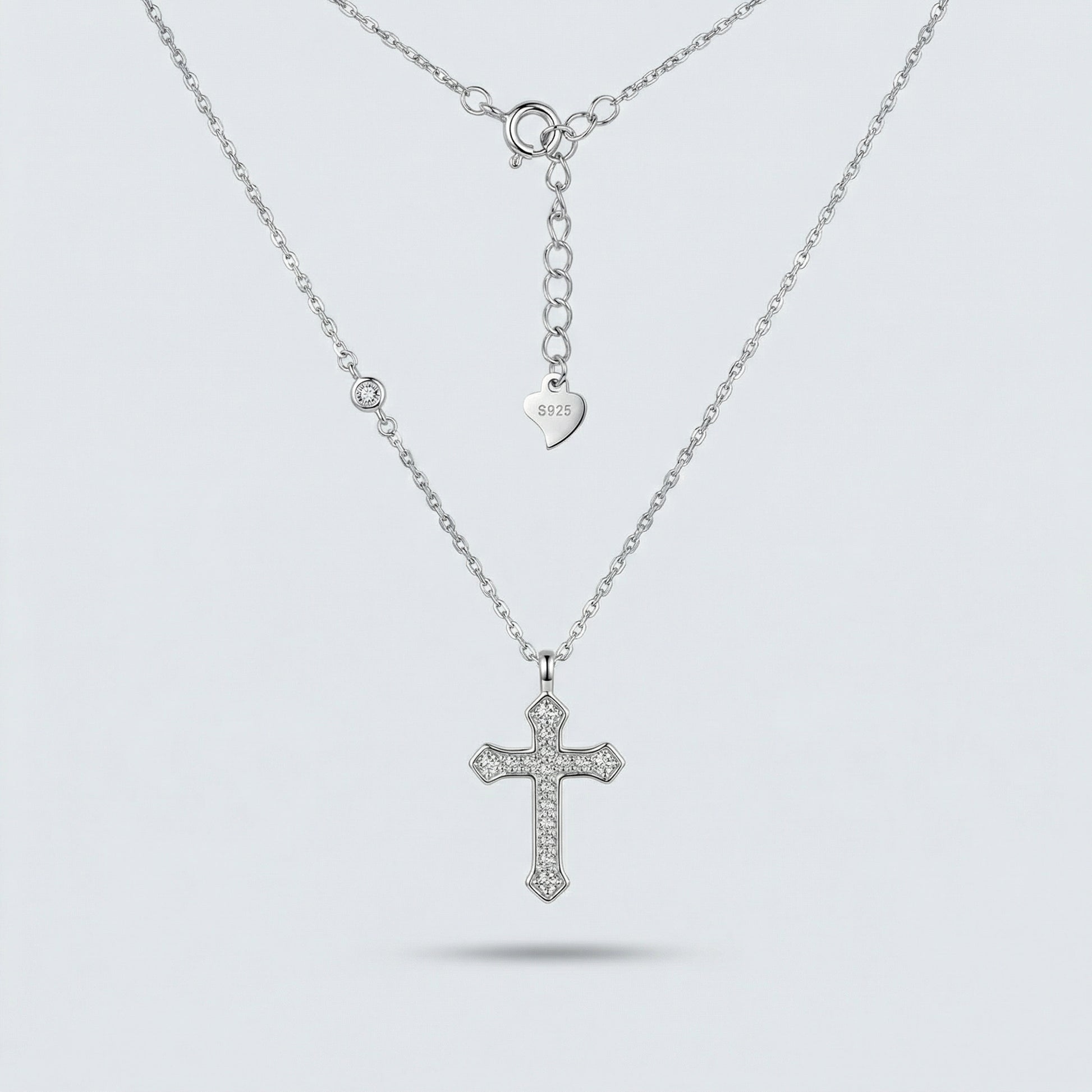 The Radiant Cross Necklace is crafted in S925 sterling silver and delicately set with shimmering stones that catch the light with subtle elegance. Its balanced proportions and clean silhouette make it both meaningful and effortlessly wearable.
