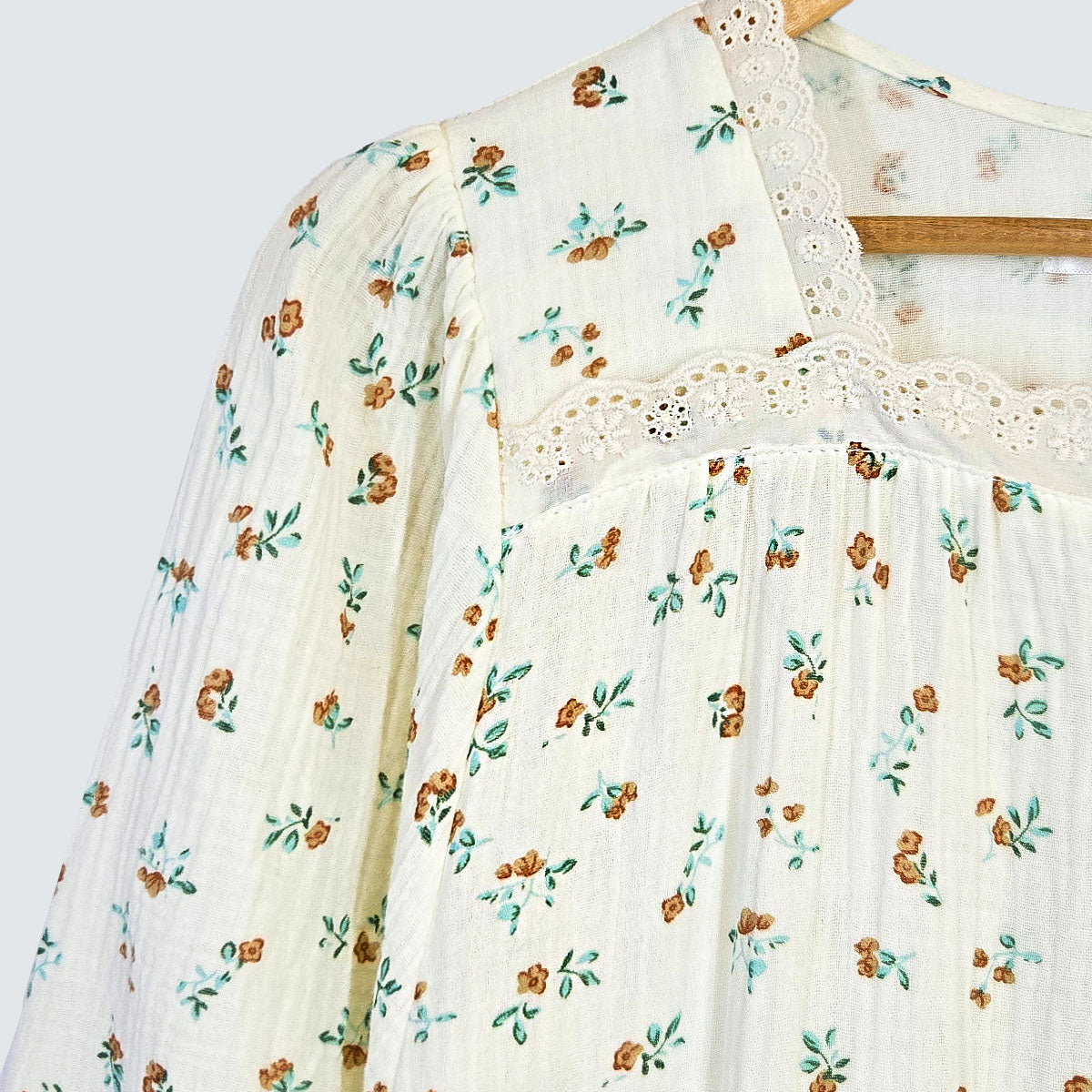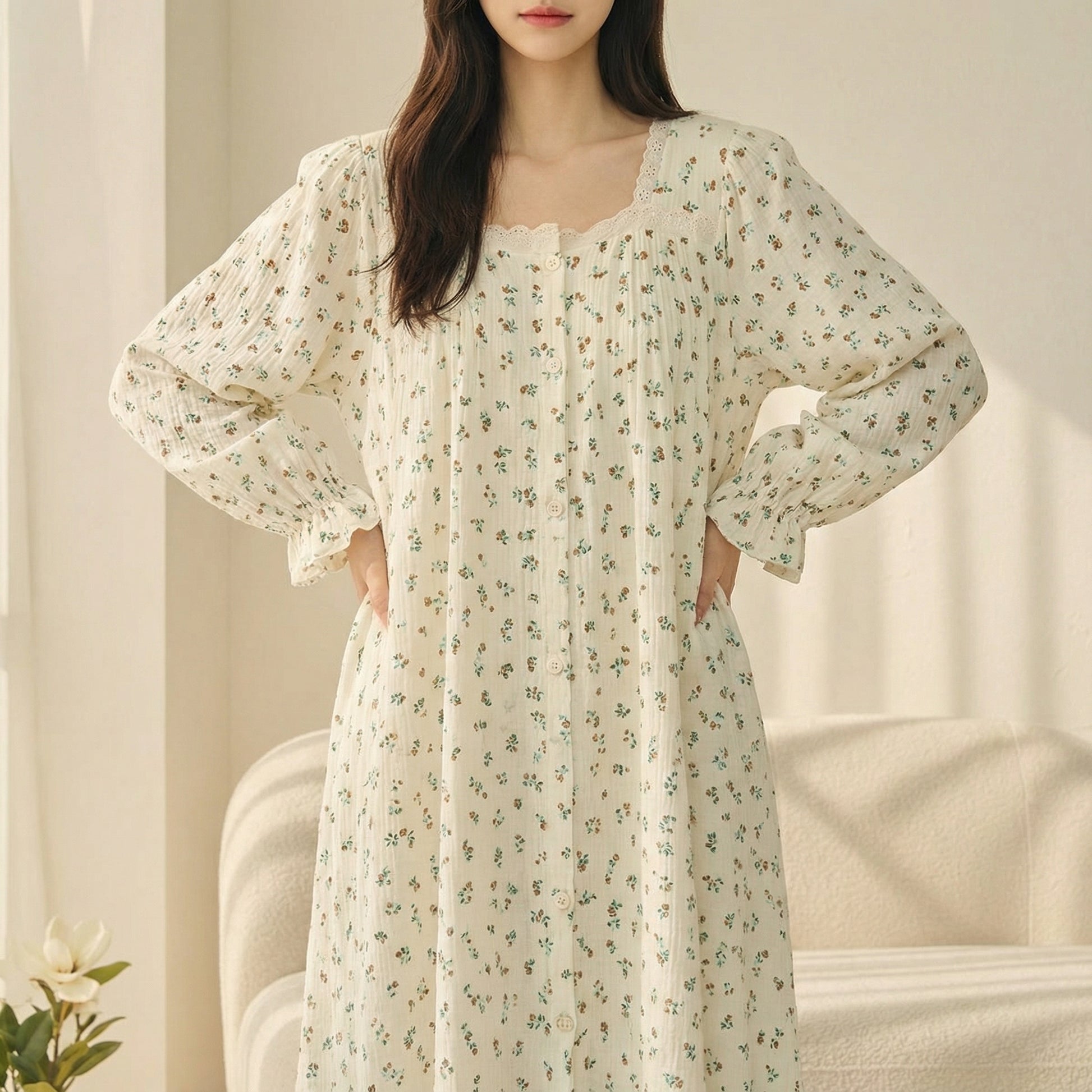 A soft double-gauze floral long dress with lace details, offering a relaxed, cozy fit perfect for home and sleep. One size with a comfortably relaxed, generous fit.