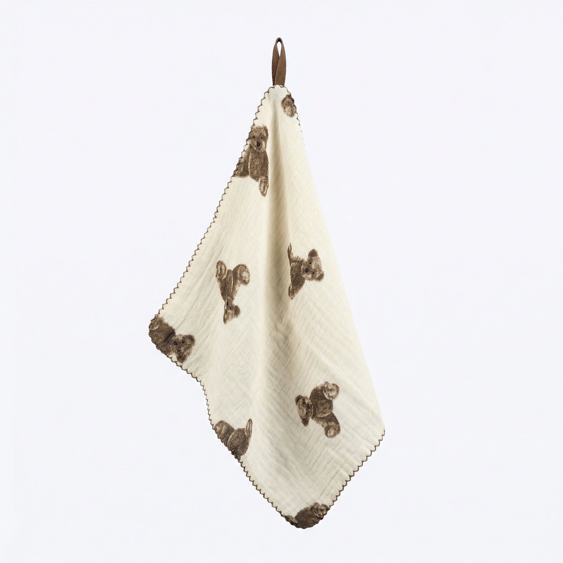 The rich brown tones create a cozy, timeless feel while the lightweight double-layer cotton gauze keeps it breathable and gentle on skin. Finished with delicate scalloped stitching along the edges, this piece blends softness with subtle charm.