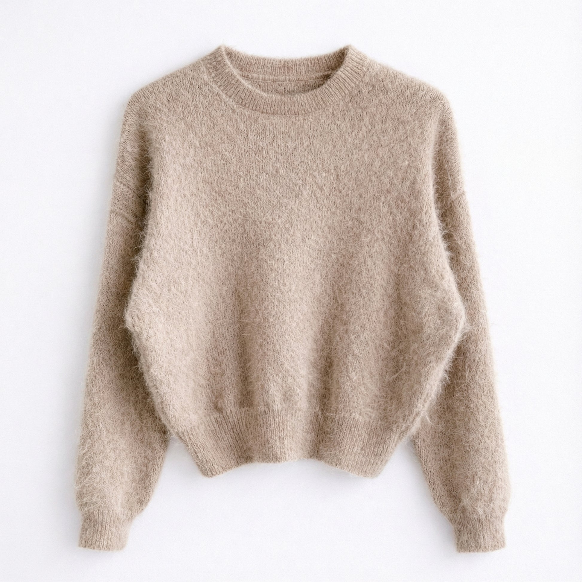 A soft, airy knit pullover with a delicate fuzzy texture that feels light yet cozy on the skin. Designed with a relaxed silhouette and gentle volume through the sleeves, this piece creates an effortlessly feminine mood without feeling heavy. The subtly cropped length pairs beautifully with high-waist skirts or trousers, making it easy to dress up or down. Perfect for adding warmth and softness to everyday looks while maintaining a clean, refined aesthetic.
