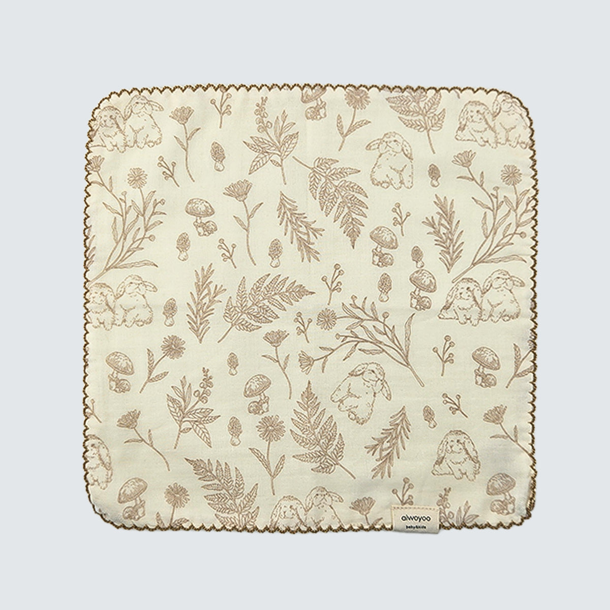 The print features a soft, storybook-style forest scene with gentle illustrations of rabbits, leaves, flowers, and mushrooms in warm beige tones.