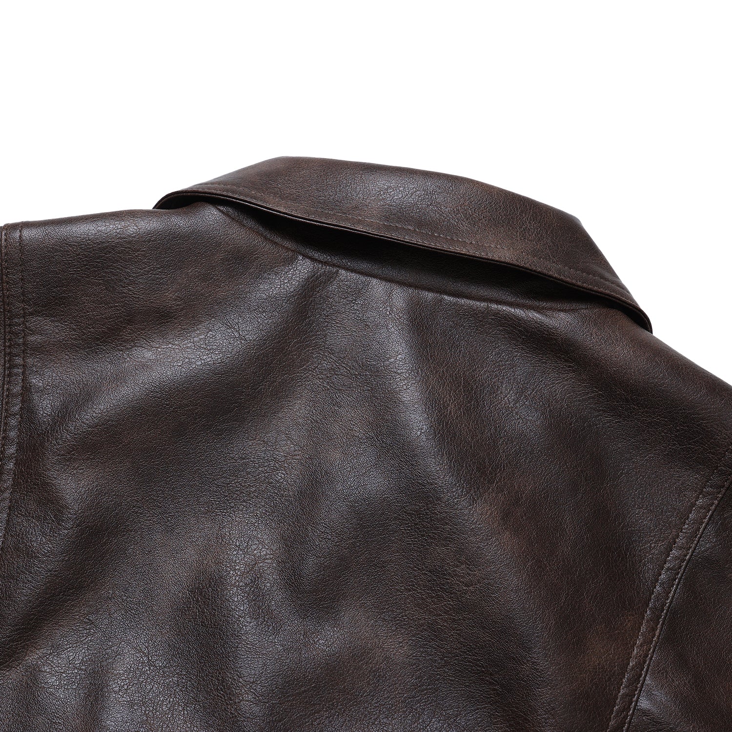 This faux leather jacket is crafted from a soft, matte-finish material with a naturally worn-in texture. Designed with a clean, minimal silhouette, it features subtle panel lines and distinctive elbow patches that add both character and durability.