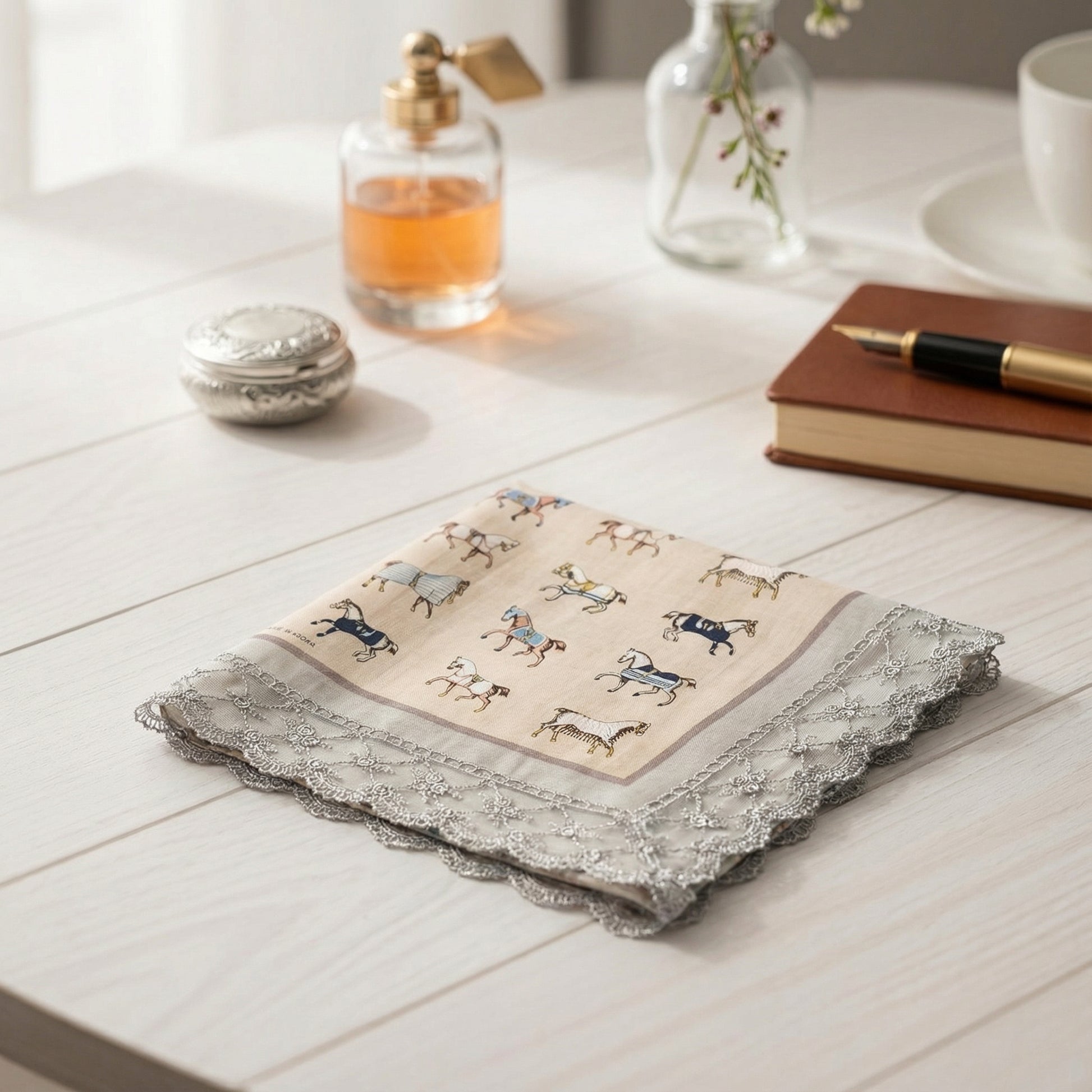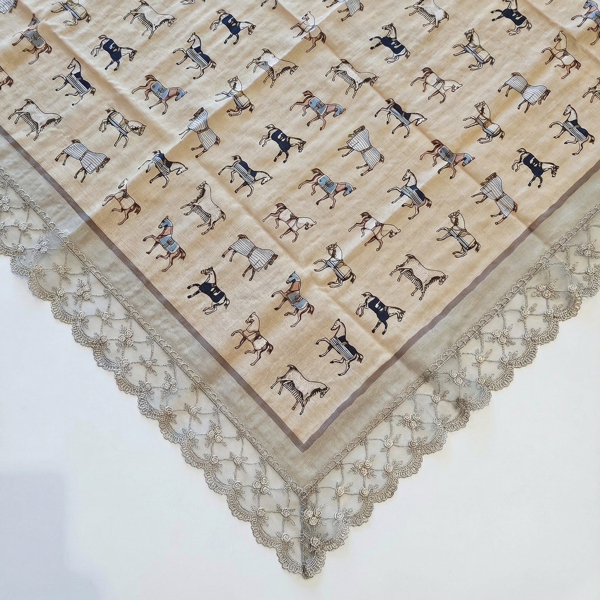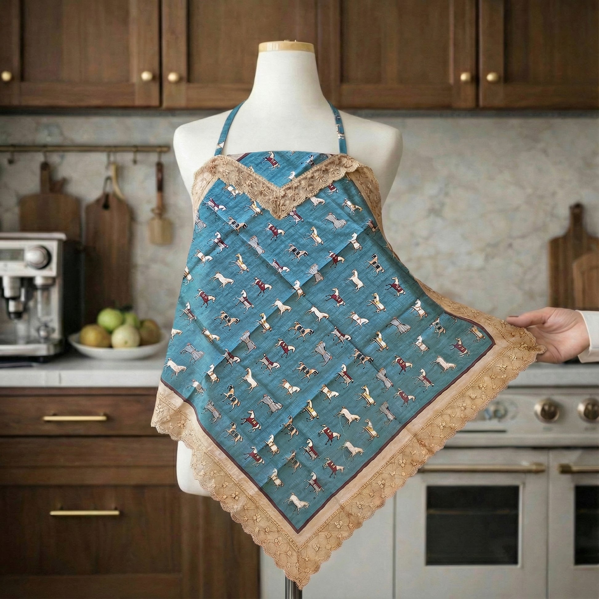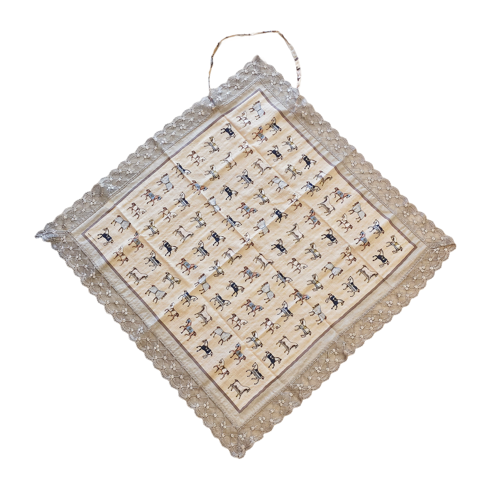 A vintage-inspired etiquette handkerchief apron finished with delicate lace trim. Designed in a classic diamond silhouette, this piece features a refined horse motif print and soft lace detailing that adds an elegant, timeless touch. Thoughtfully created to protect your outfit while dining out, it helps prevent stains without compromising your style. Lightweight and comfortable, it drapes naturally and remains discreet when worn, making it both practical and graceful. Perfect for everyday use, dining occasions, or adding a subtle vintage mood to your routine.