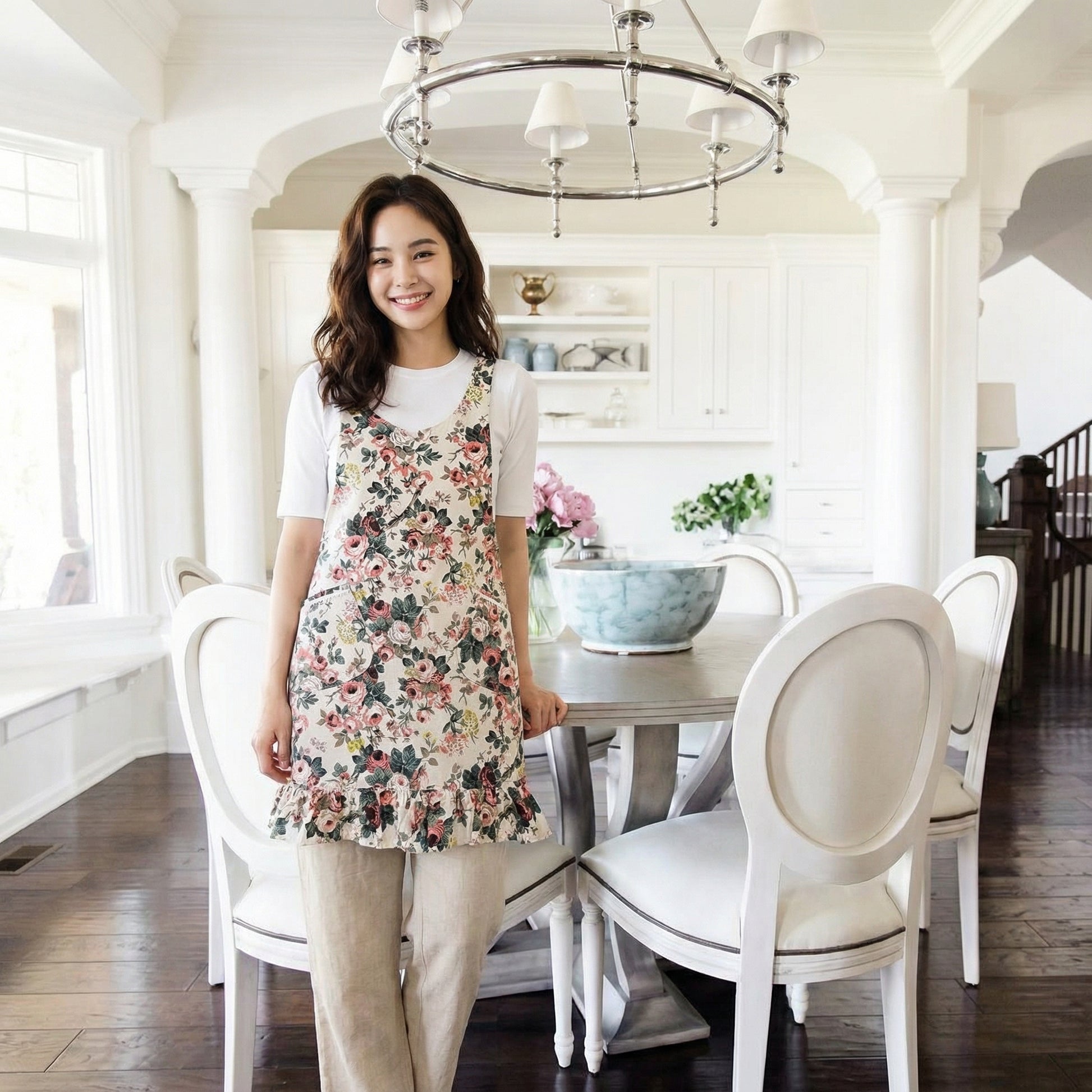 A romantic vintage-rose floral apron crafted from 100% cotton for a soft,